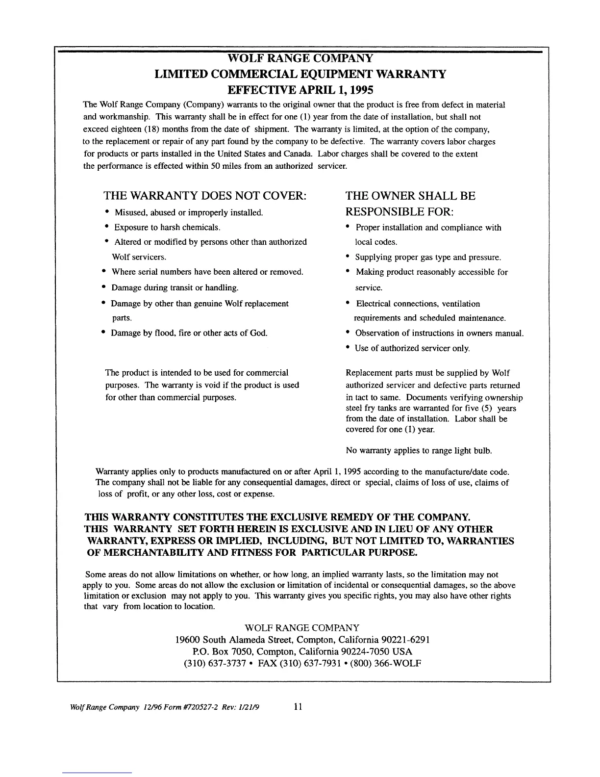 Wolf RC(SIZE)E - COMMERCIAL EQUIPMENT WARRANTY; WARRANTY COVERAGE EXCLUSIONS; OWNER RESPONSIBILITIES AND LIMITATIONS
