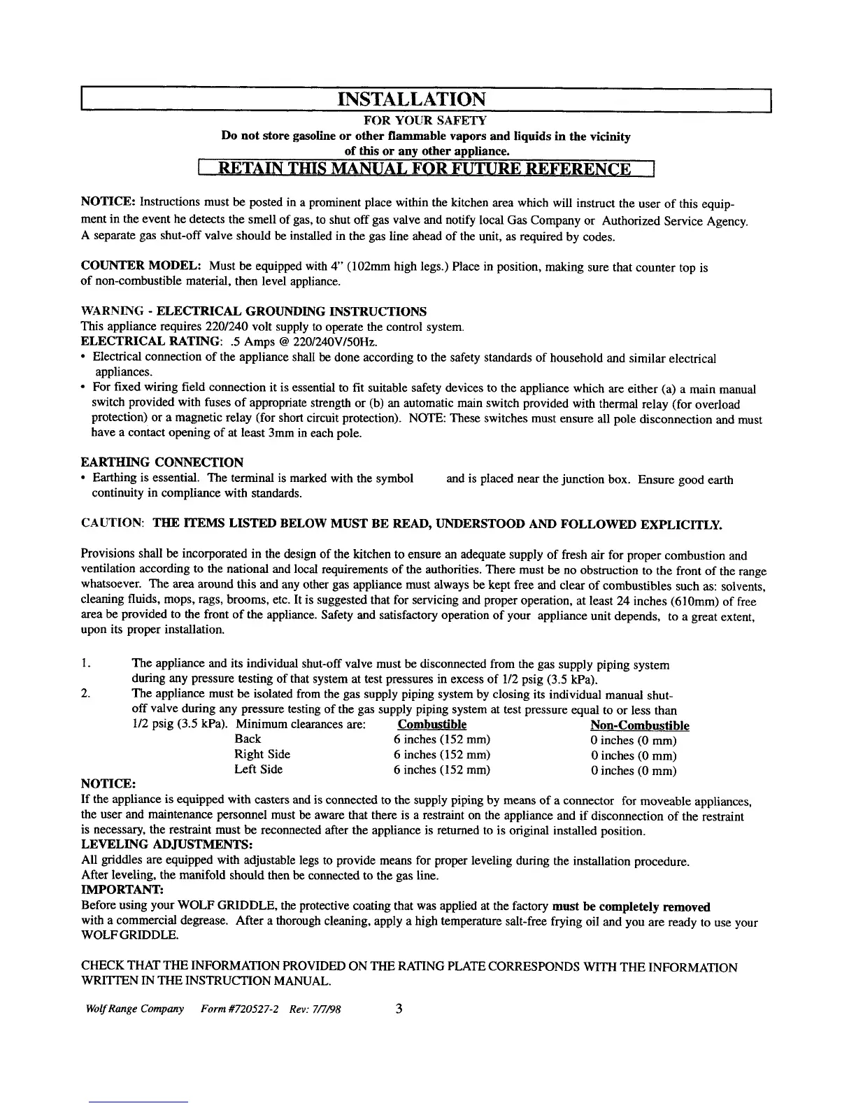 Wolf RC(SIZE)E - INSTALLATION PROCEDURES; ELECTRICAL GROUNDING AND EARTHING; INSTALLATION CLEARANCES AND LEVELING; INITIAL USE PREPARATION