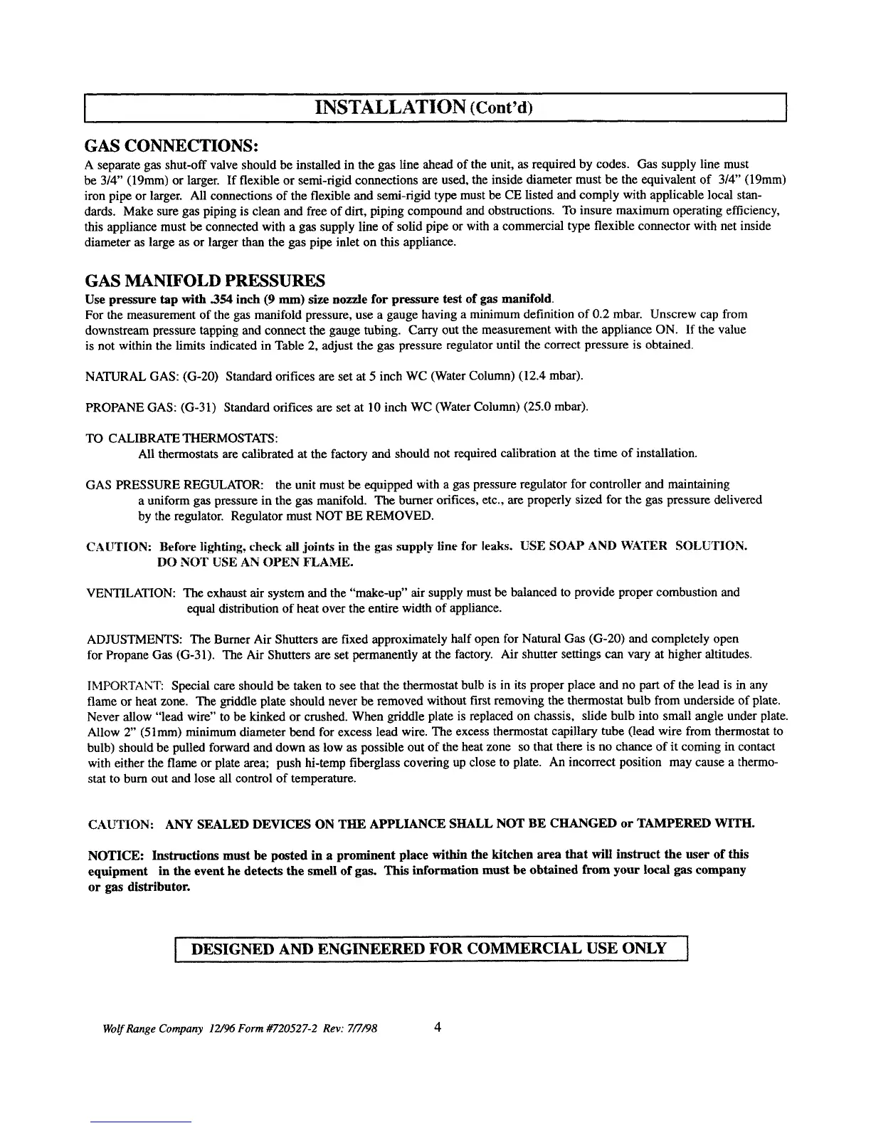 Wolf RC(SIZE)E - INSTALLATION CONTINUED; GAS CONNECTIONS AND MANIFOLD PRESSURES; GAS REGULATOR AND VENTILATION; THERMOSTAT BULB PLACEMENT