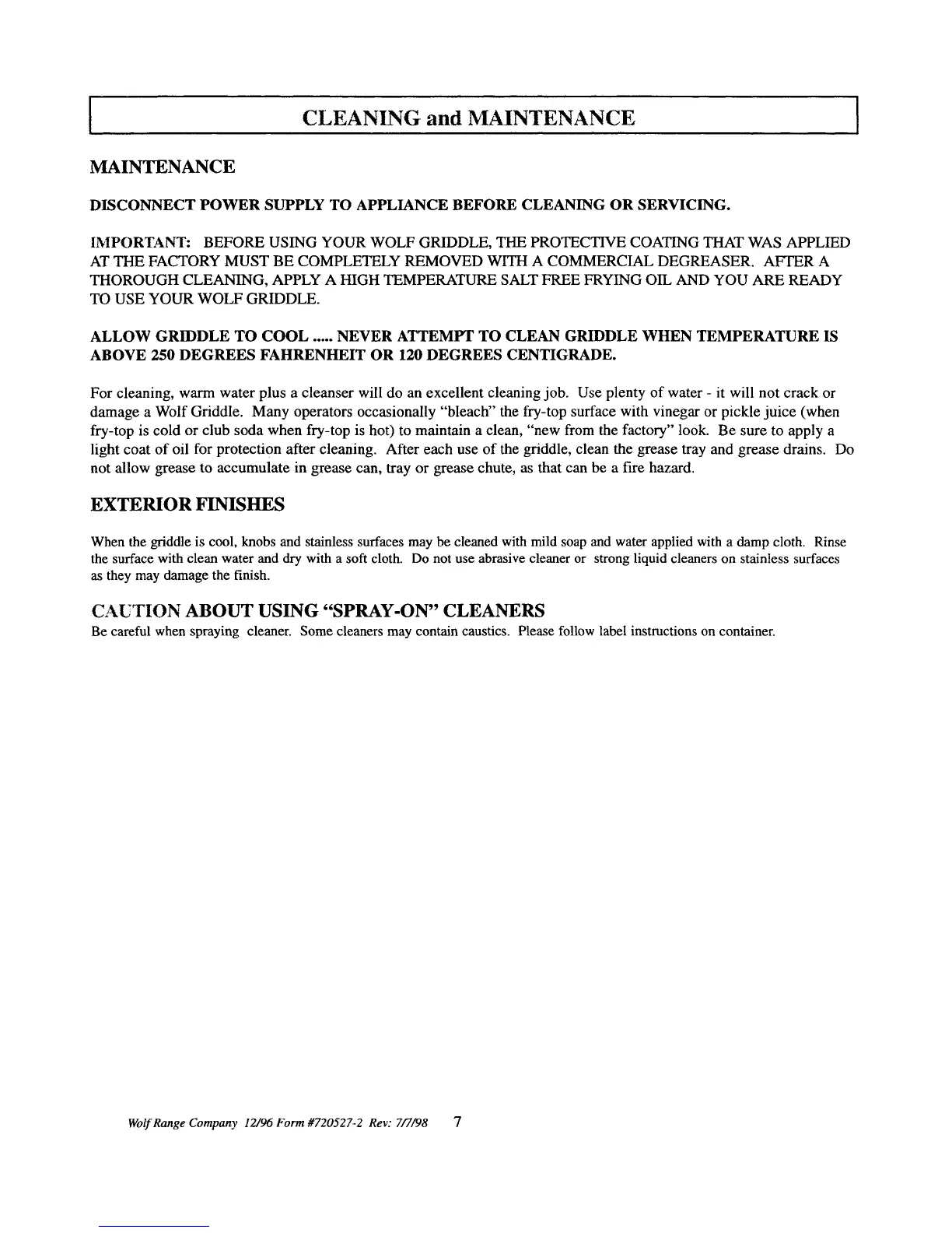 Wolf RC(SIZE)E - CLEANING AND MAINTENANCE; INITIAL GRIDDLE PREPARATION; GRIDDLE AND EXTERIOR CLEANING; SPRAY-ON CLEANERS CAUTION