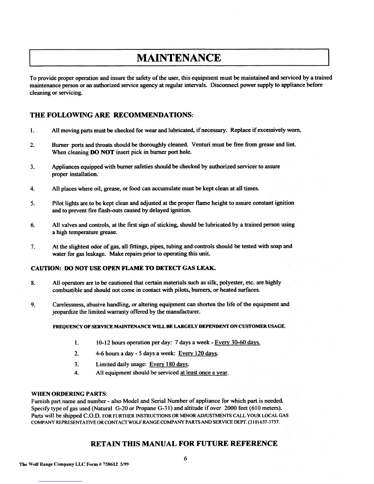 Wolf RH - Maintenance; Frequency of Service Maintenance; When Ordering Parts