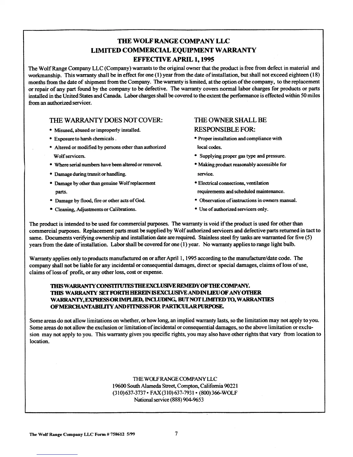 Wolf RH - Limited Commercial Equipment Warranty; The Warranty Does Not Cover; The Owner Shall Be Responsible For
