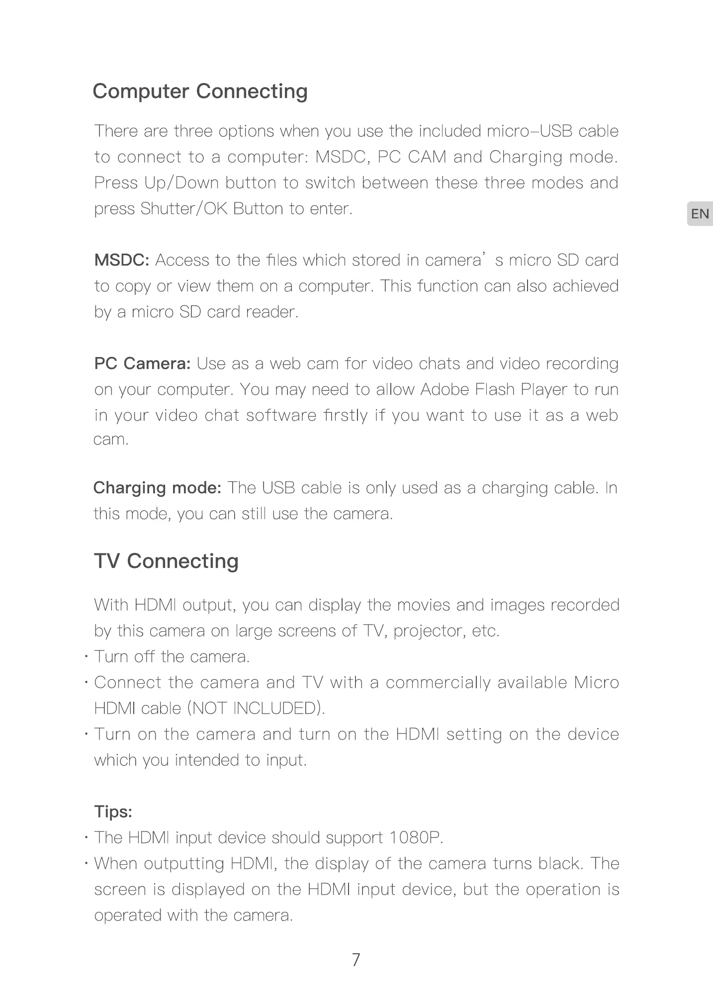 • Connect the camera and TV with a commercially available Micro