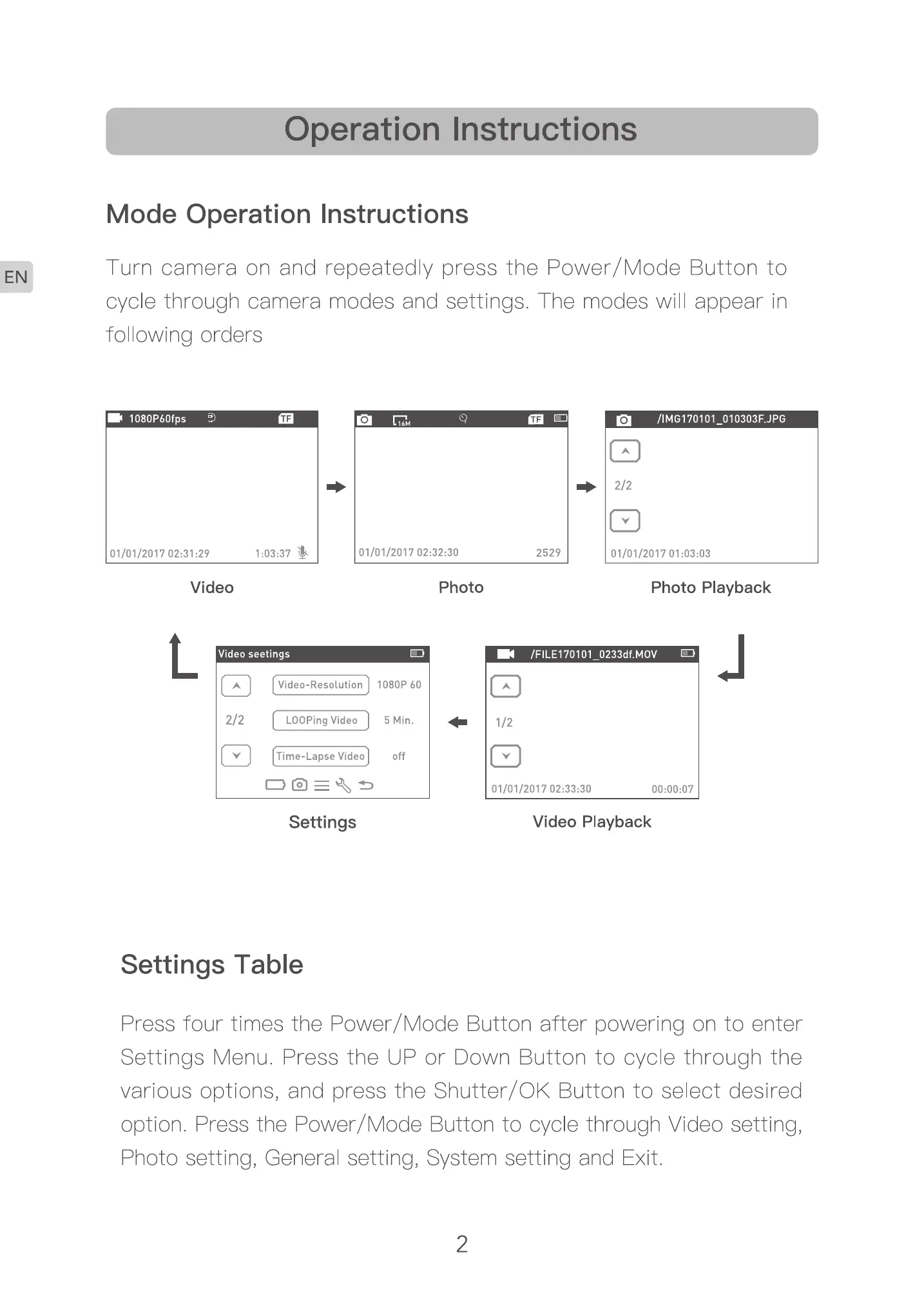 Settings Menu. Press the UP or Down Button to cycle through the