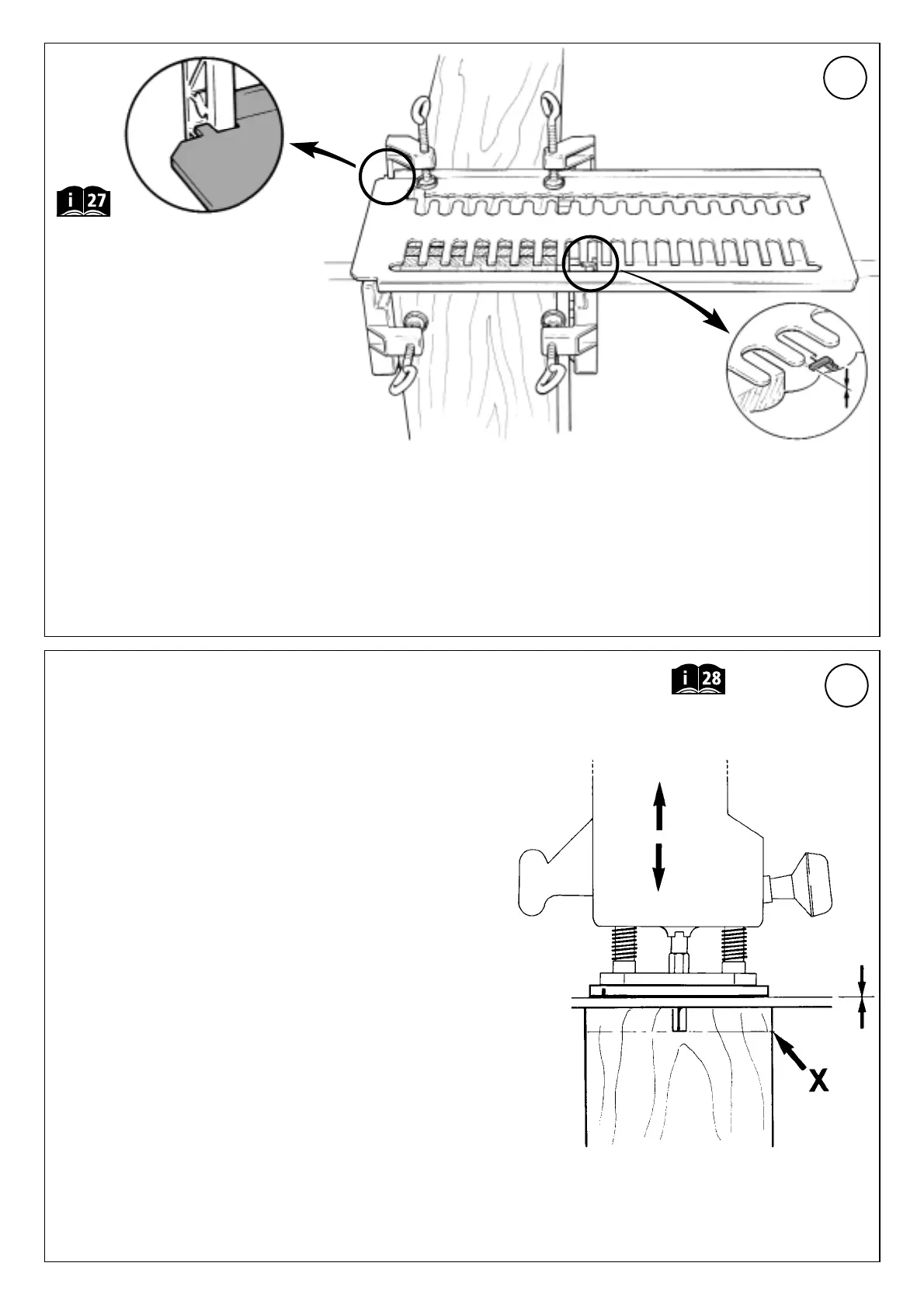 Adjust the router so that the lower edge of the bit is flush with the marker edge X ( see arrow).