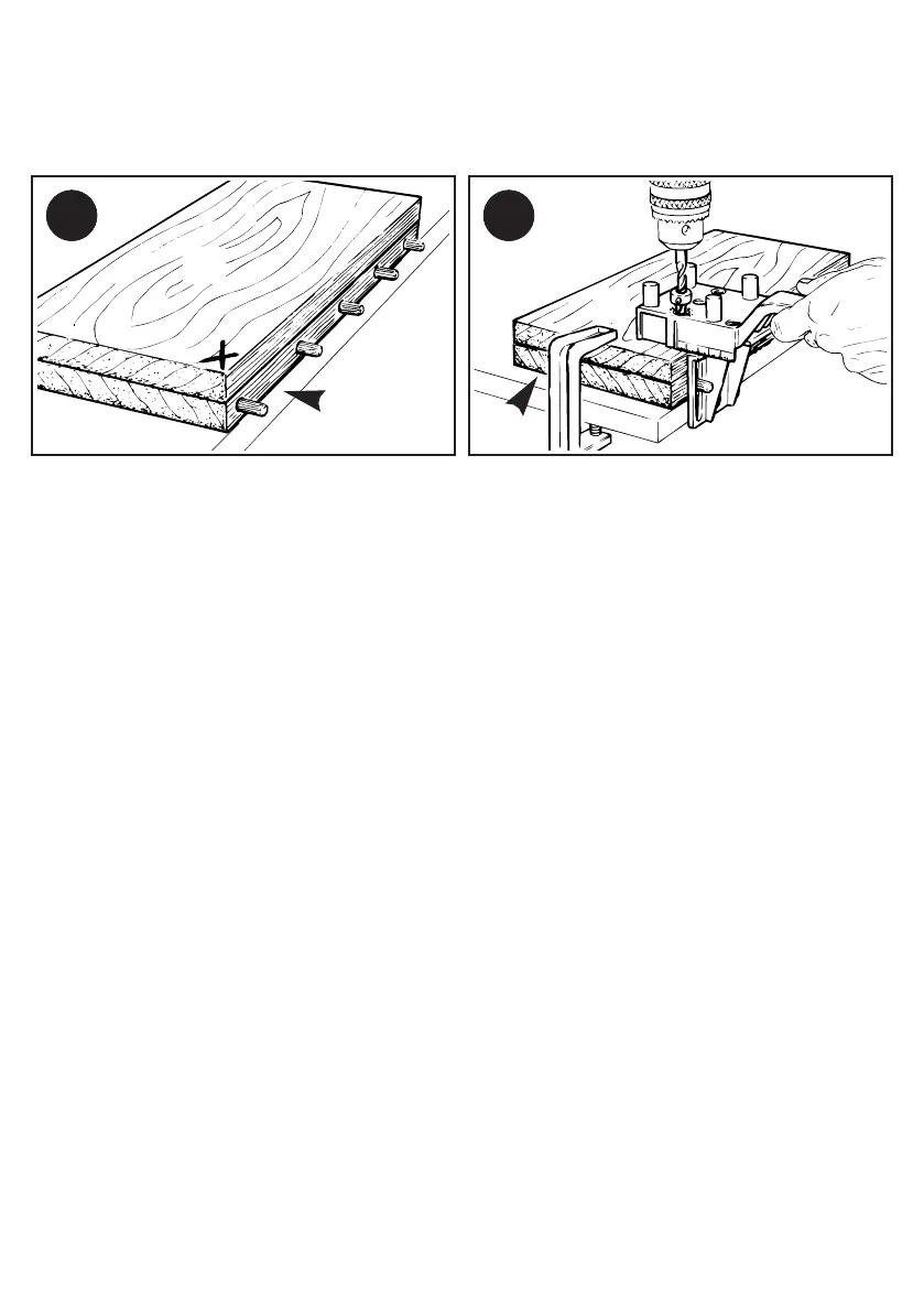 S Lägg bräda B i önskat läge på bräda A och spänn fast dem på arbetsbordet. Obs: Ställ in borrdjupsspärren igen
