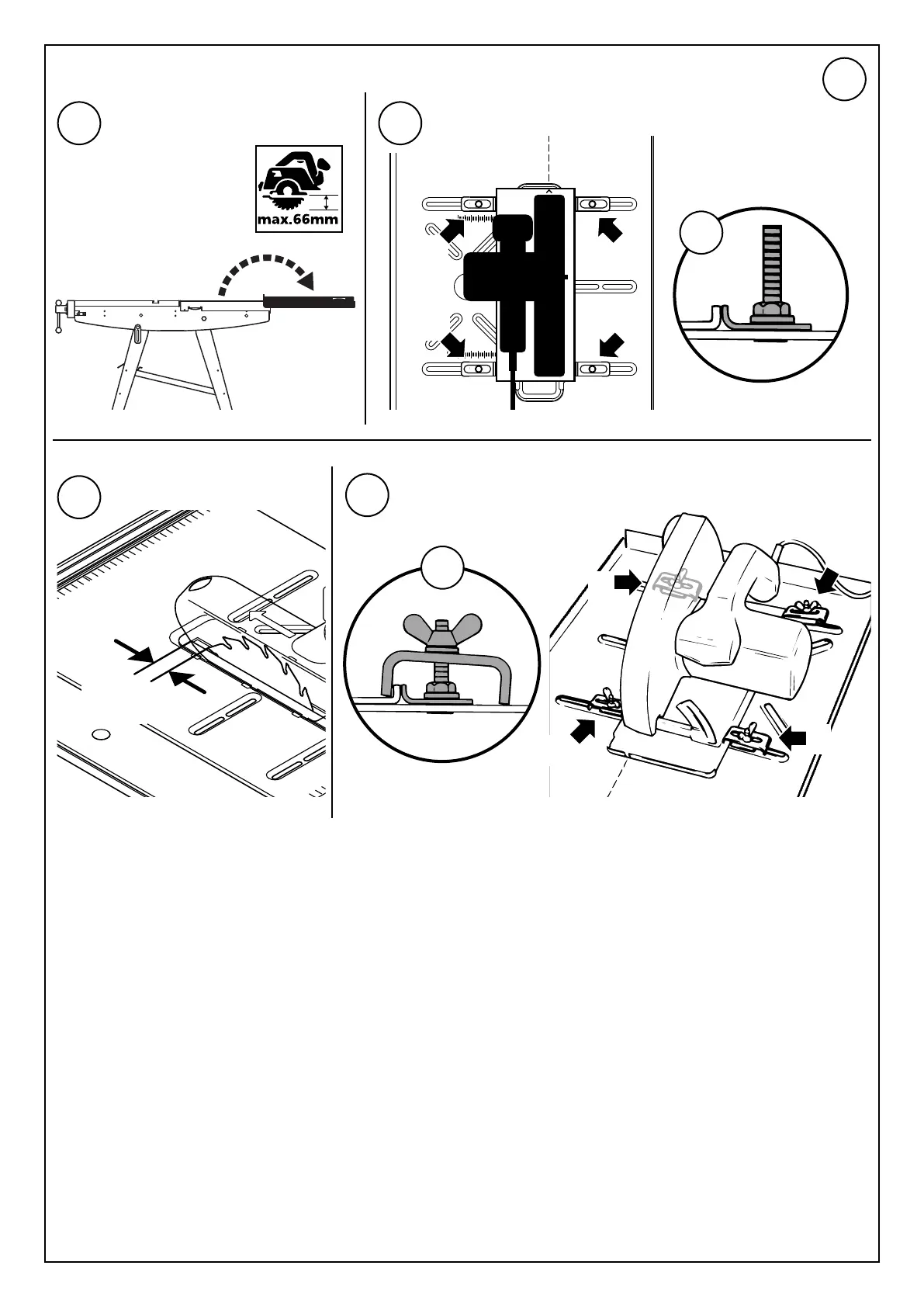p Basculer la surface de travail (180°). Ajuster la scie circulaire de sorte que la lame se trouve au milieu du guide.