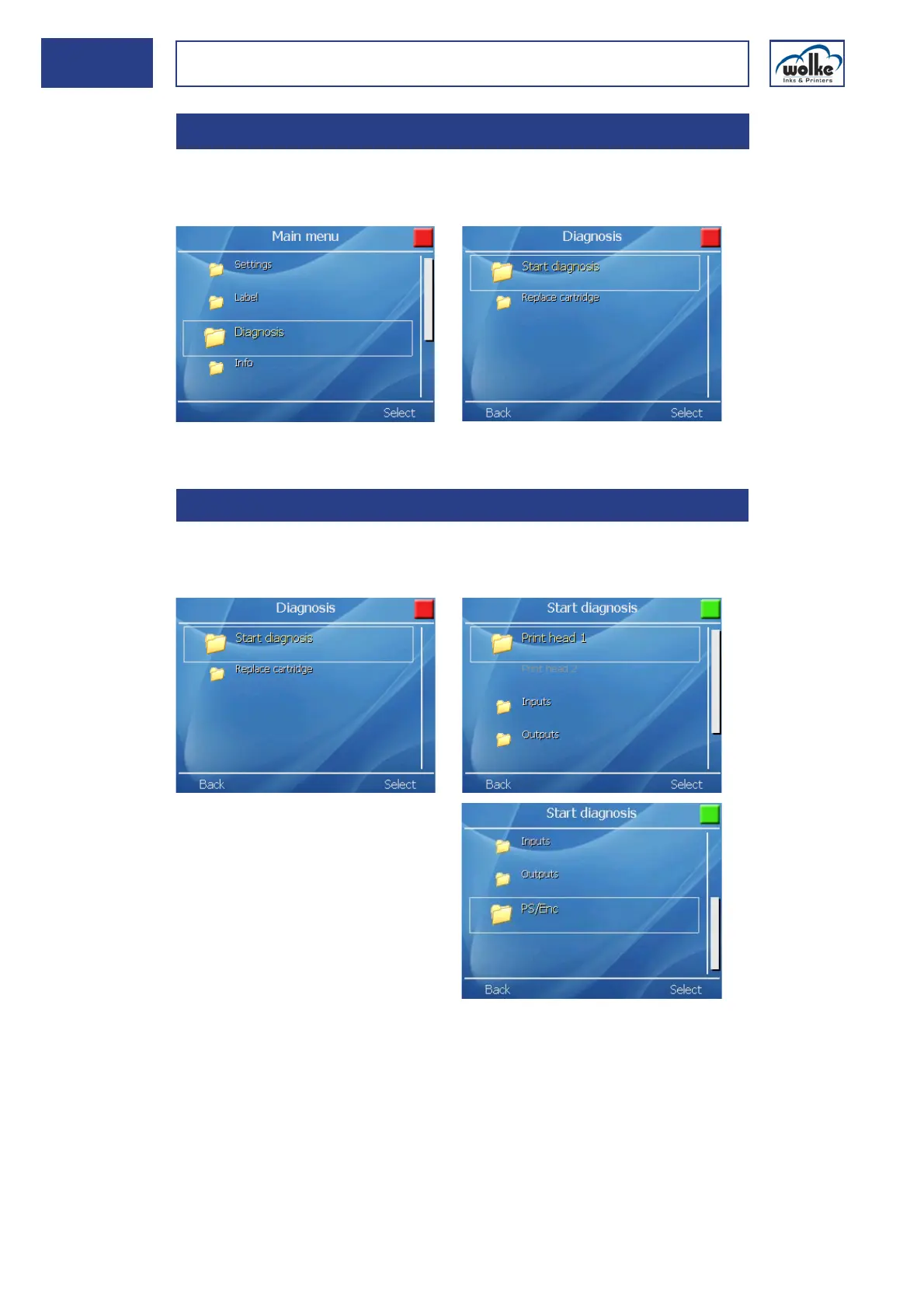 Diagnosis This menu enables you to start diagnosis or to reset the print heads after