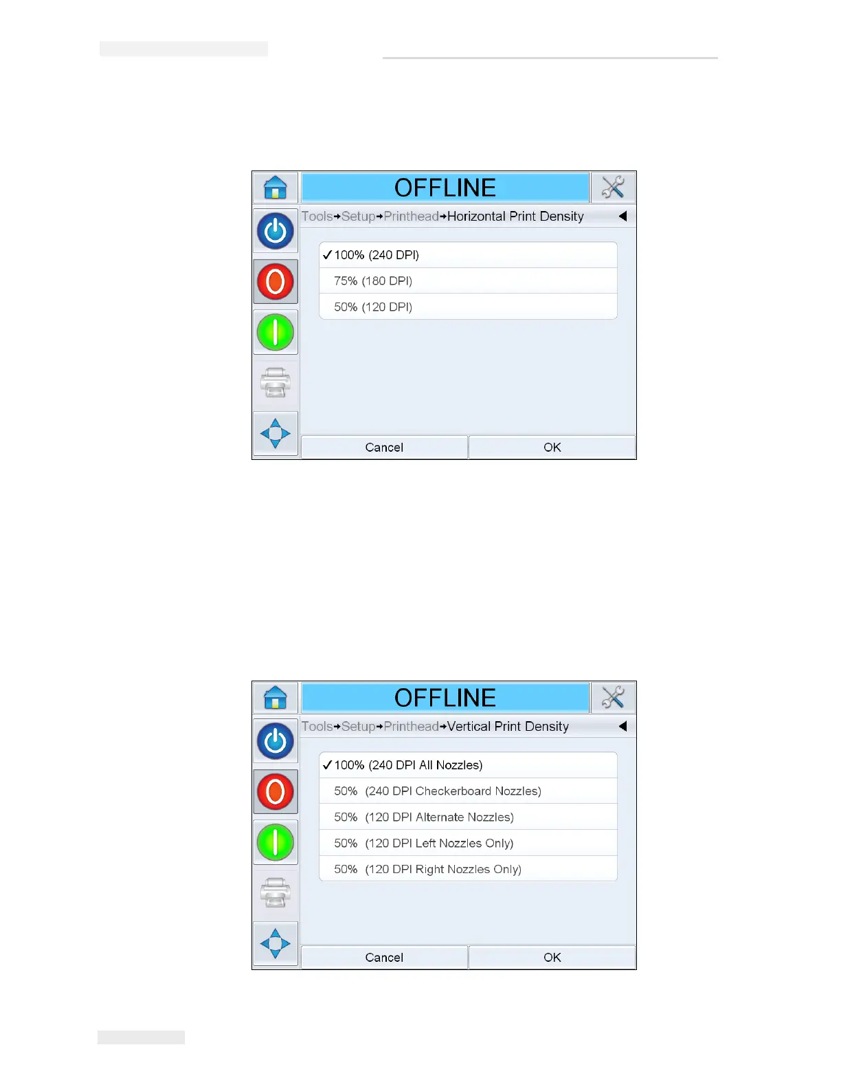 2 Navigate to Tools > Setup > Printhead > Vertical Print Density. Select the