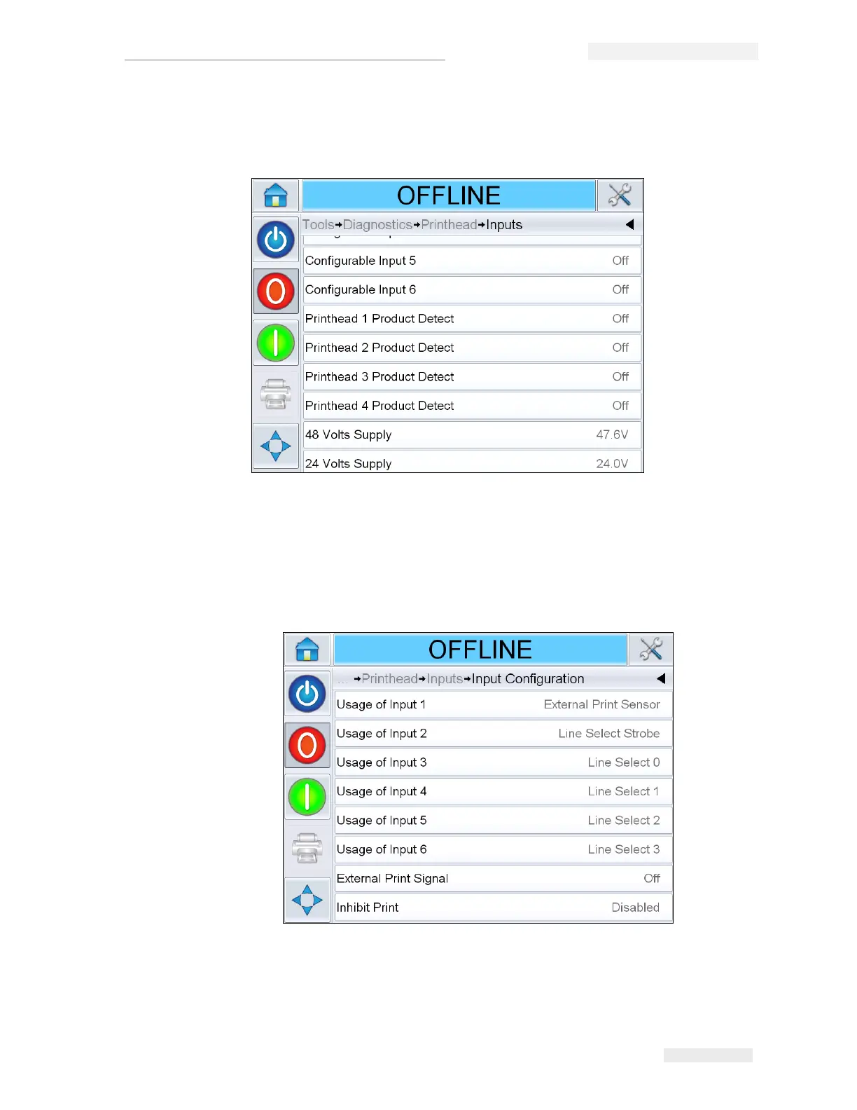 Navigate to Tools > Diagnostics > Printhead > Inputs (Figure 4-10).