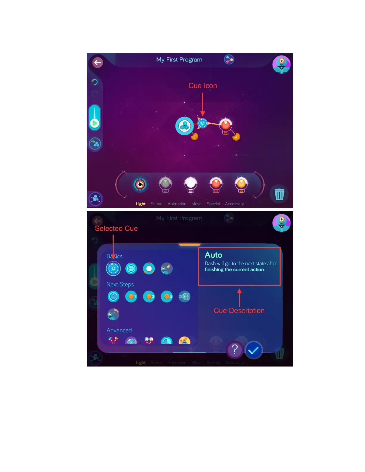 a. Usingthesameprogramyoucreated,taptheCueiconbetweentheStartstate