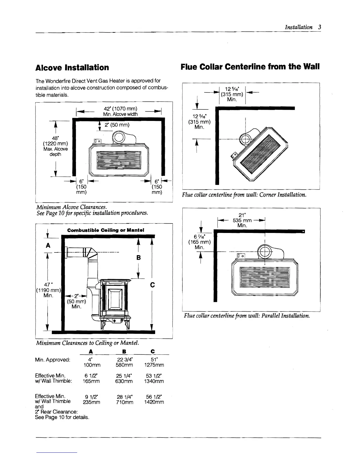 Wonderfire 2570 - Alcove Installation Requirements; Combustible Ceiling & Mantel Clearances