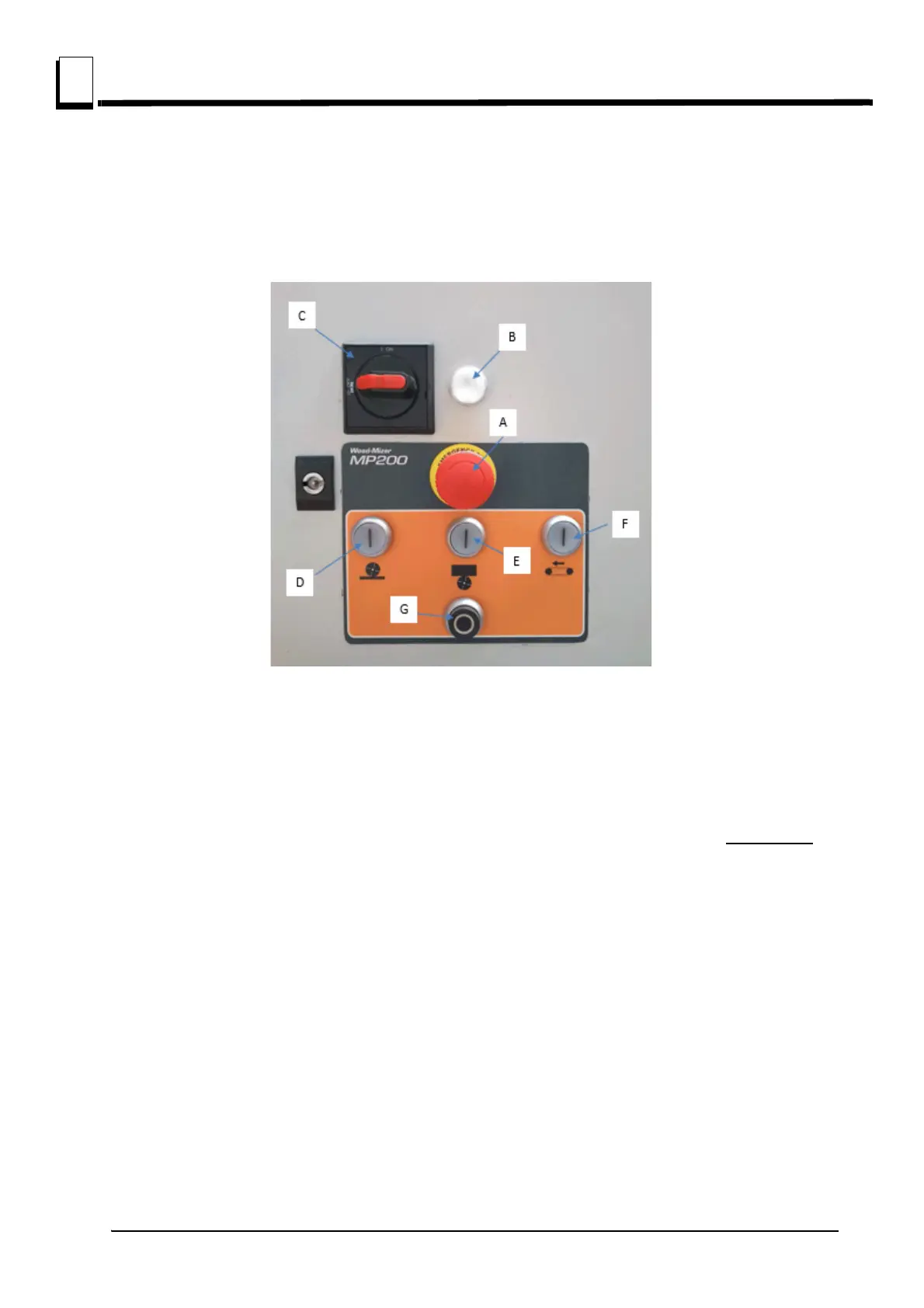 The white buttons (D, E, F) start the planer's motors. The black button (G) stops the planer's motors.
