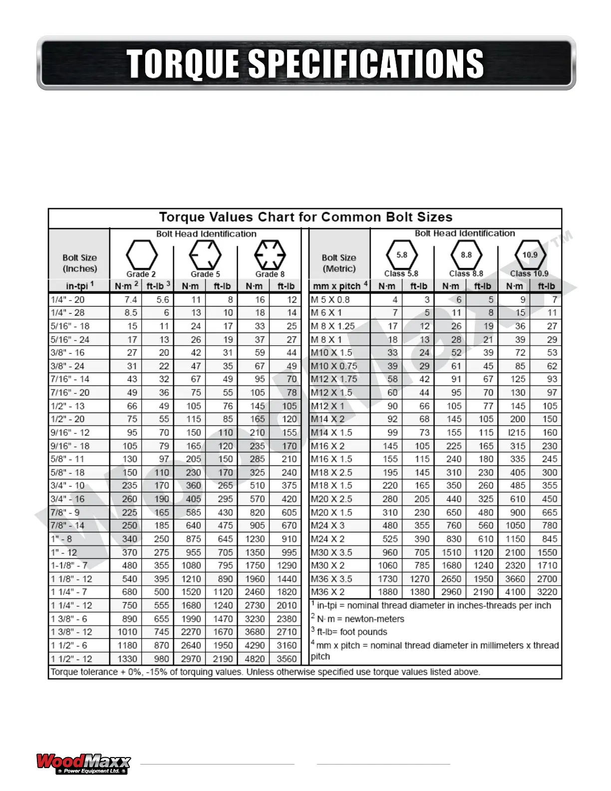 WoodMaxx WM Series - Torque Specifications; Bolt Torque Values