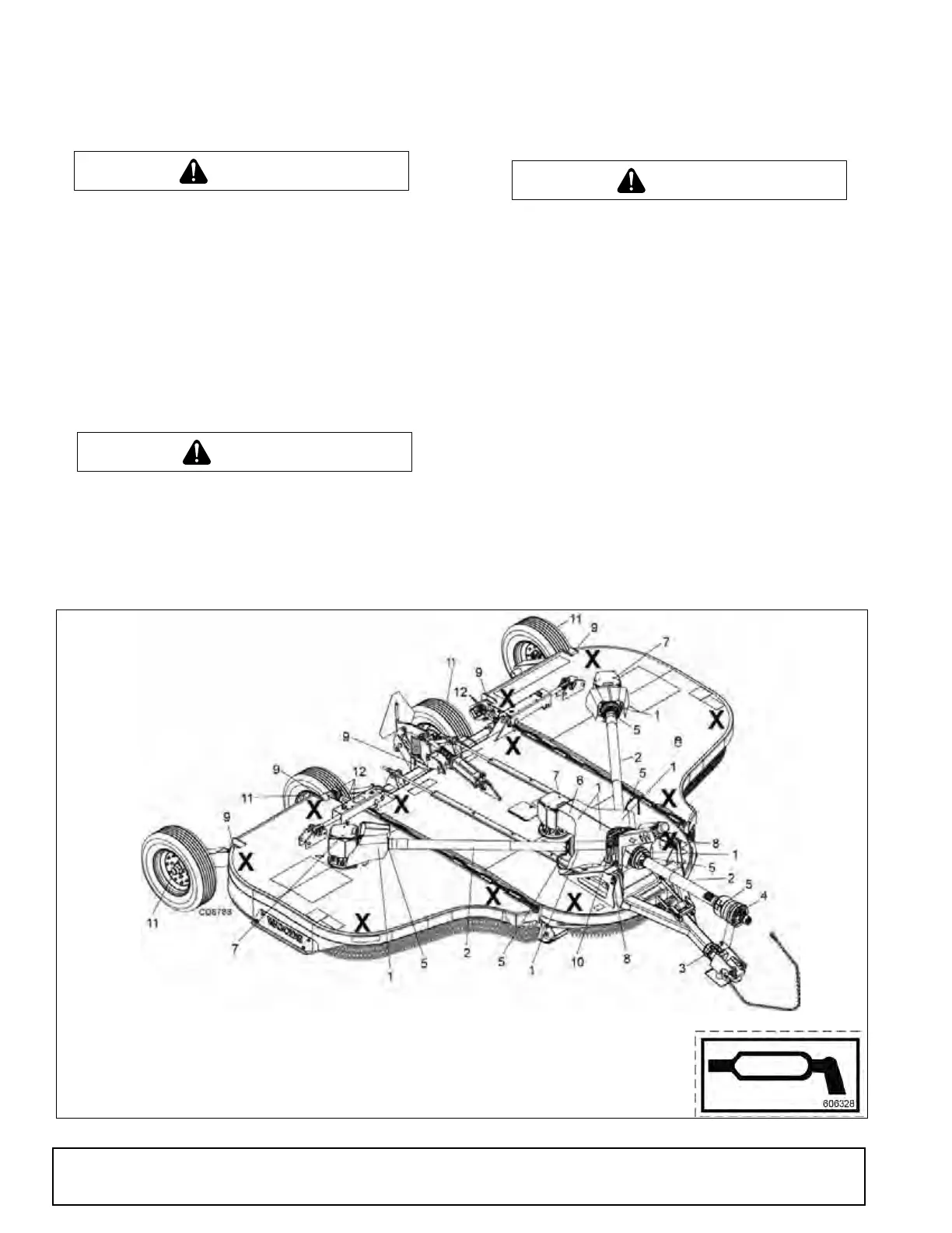 ■ Before working underneath, disconnect driveline from tractor, lower