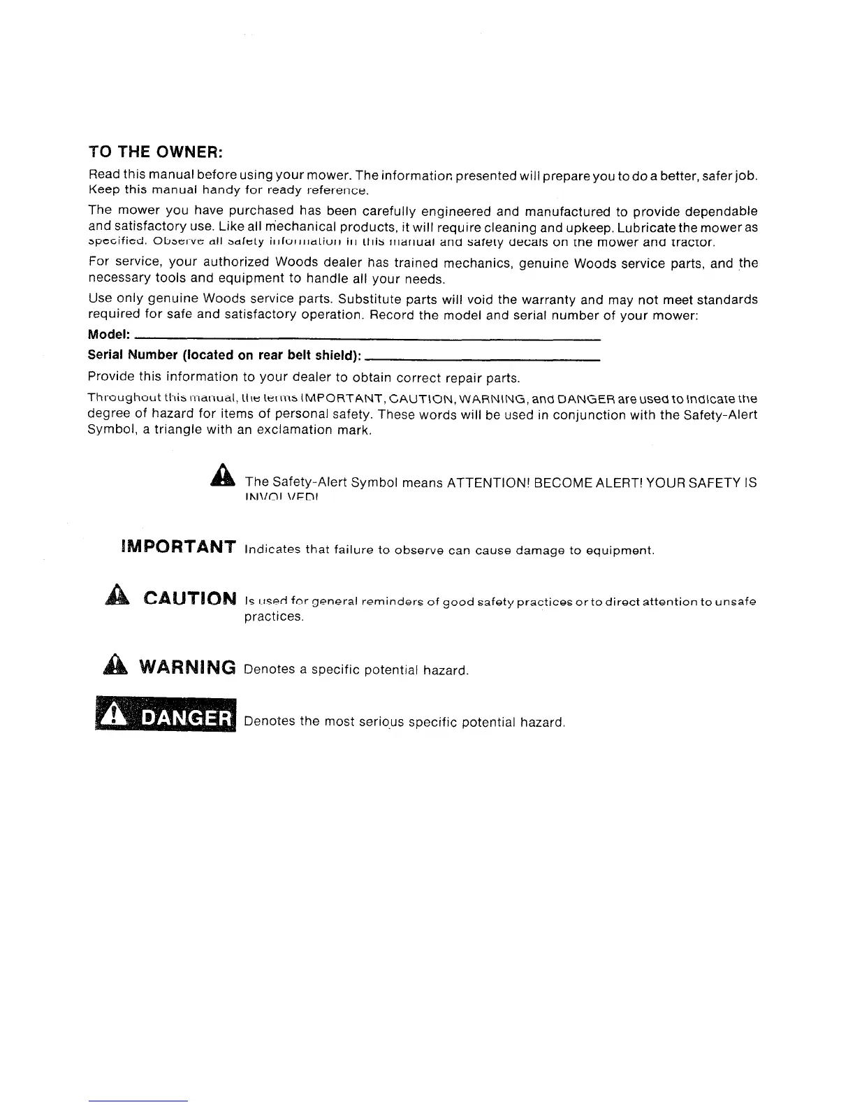 Woods L59 - Introduction, Specifications & Owner Information; Owner Information and Safety Introduction; Record Model & Serial Number; Understanding Safety Alert Symbols