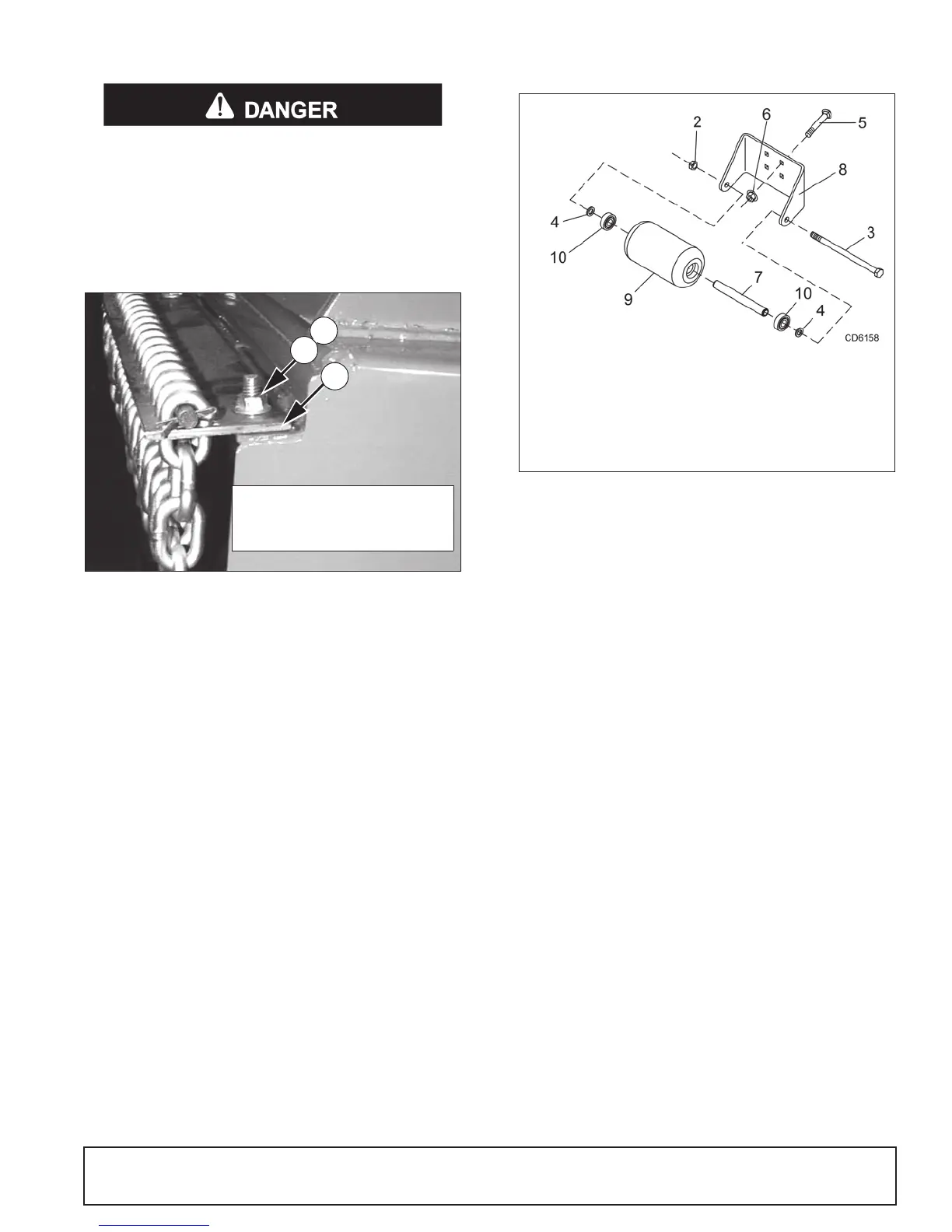 Place roller bracket (8) over bolts; then install flange whiz nuts (6) on