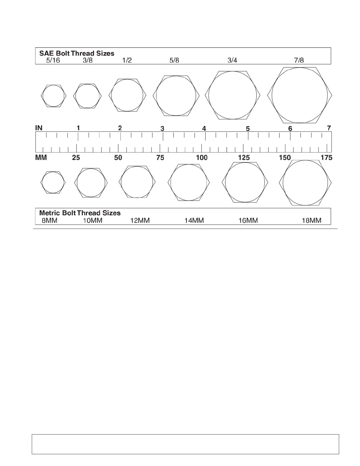 NOTE: Chart shows bolt thread sizes and corresponding head (wrench) sizes for standard SAE and metric bolts.