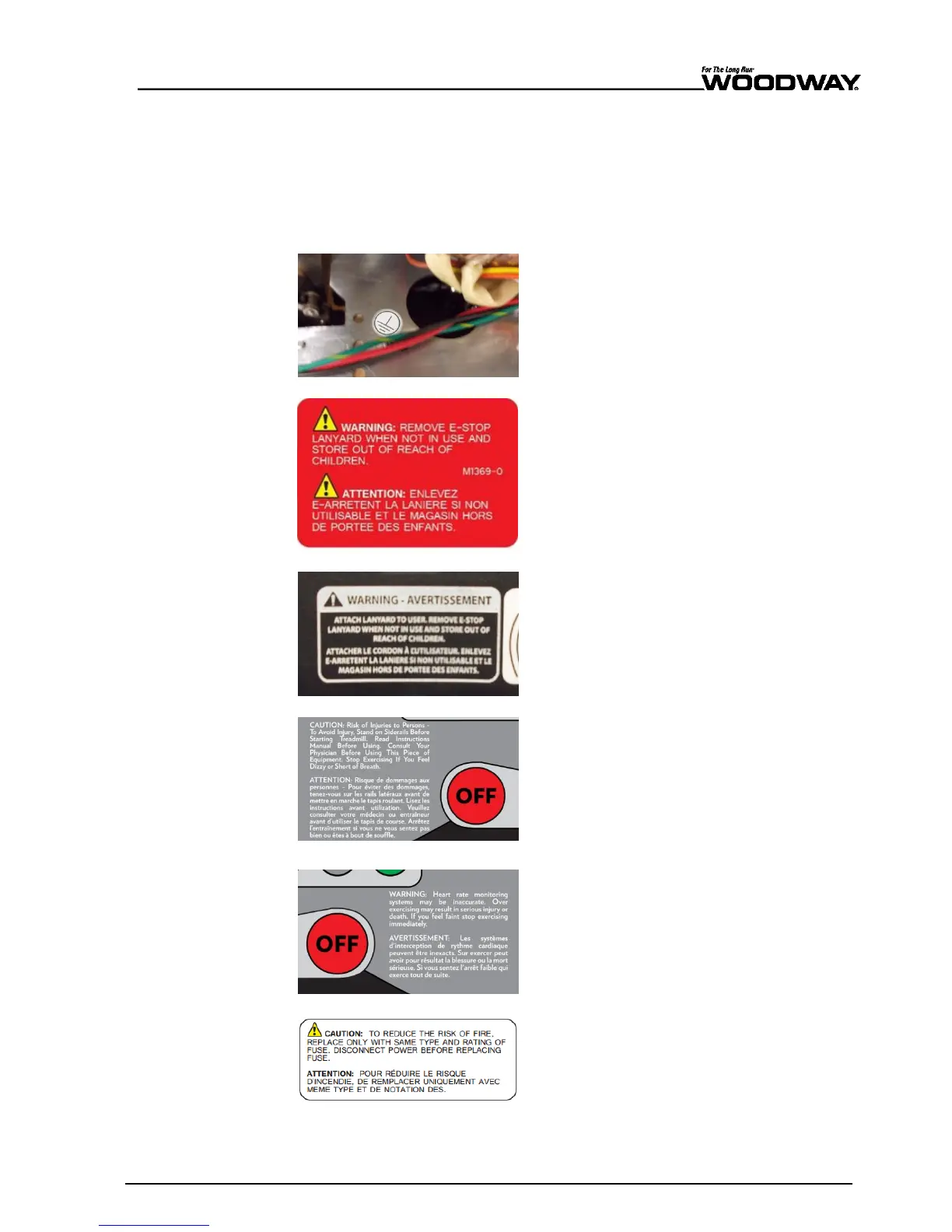 The treadmills are equipped with the following listed safety markings. Replace the safety