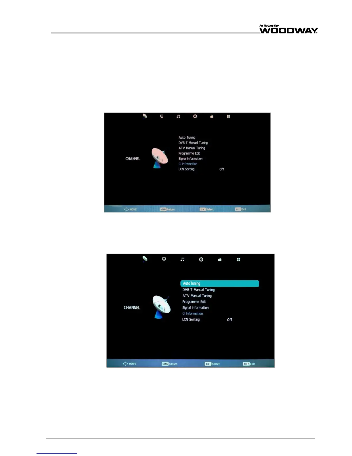 “CHANNEL” menu with the antenna icon (first icon).