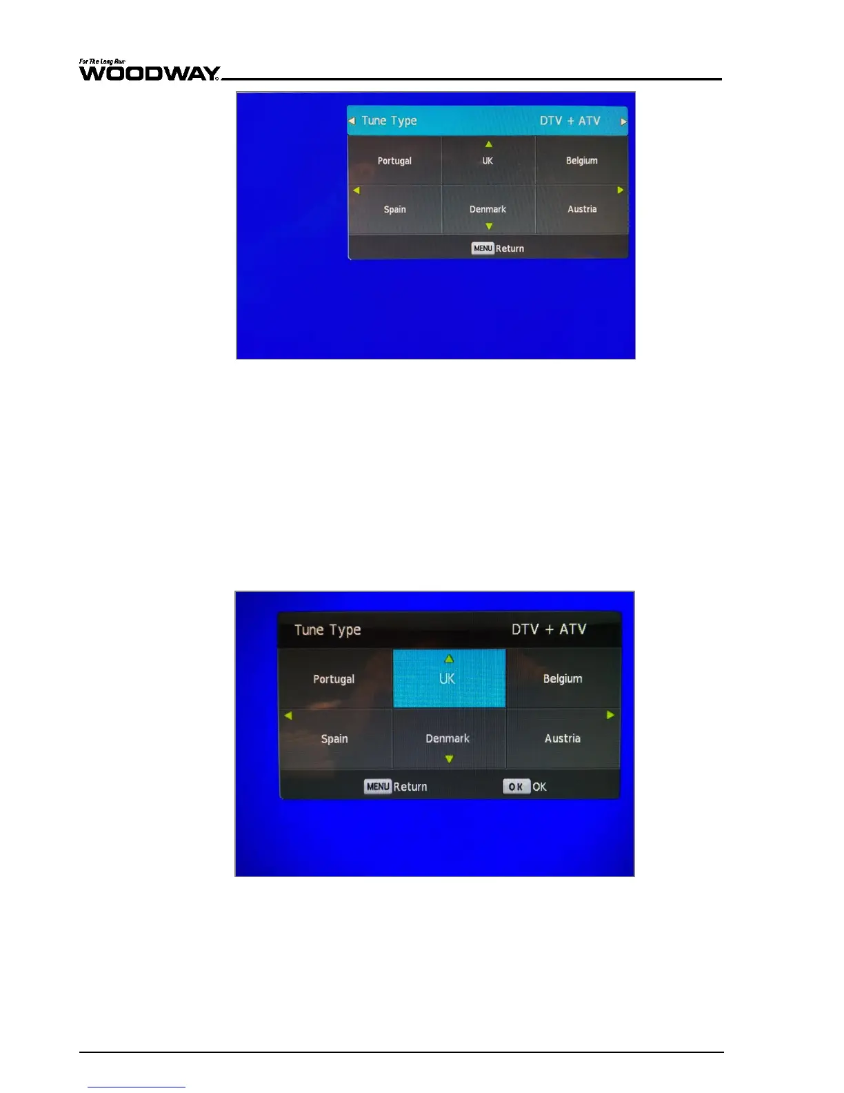 7. Press the CH [-] button to reach the country selection option of the menu.