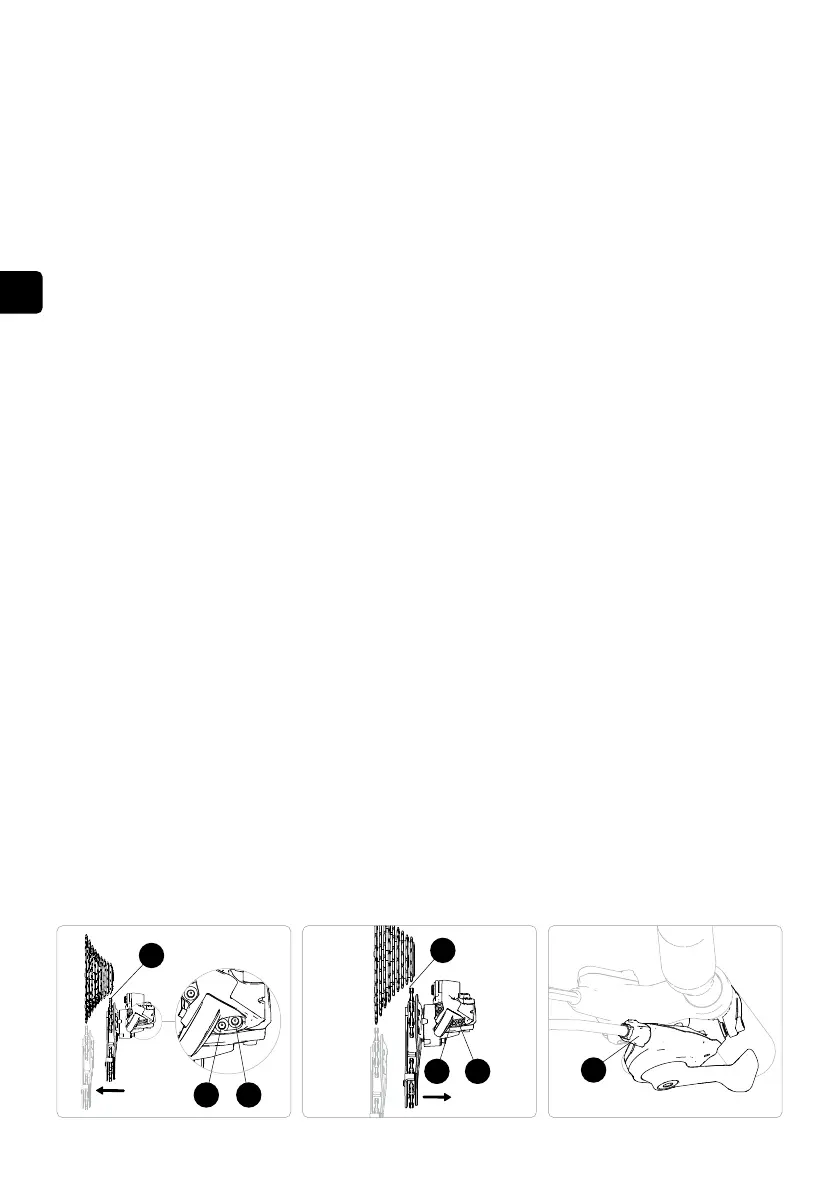 door de stelschroef (2) op de schakelhendel tegen de klok in te draaien. Slaat de ketting bij het schakelen meerdere