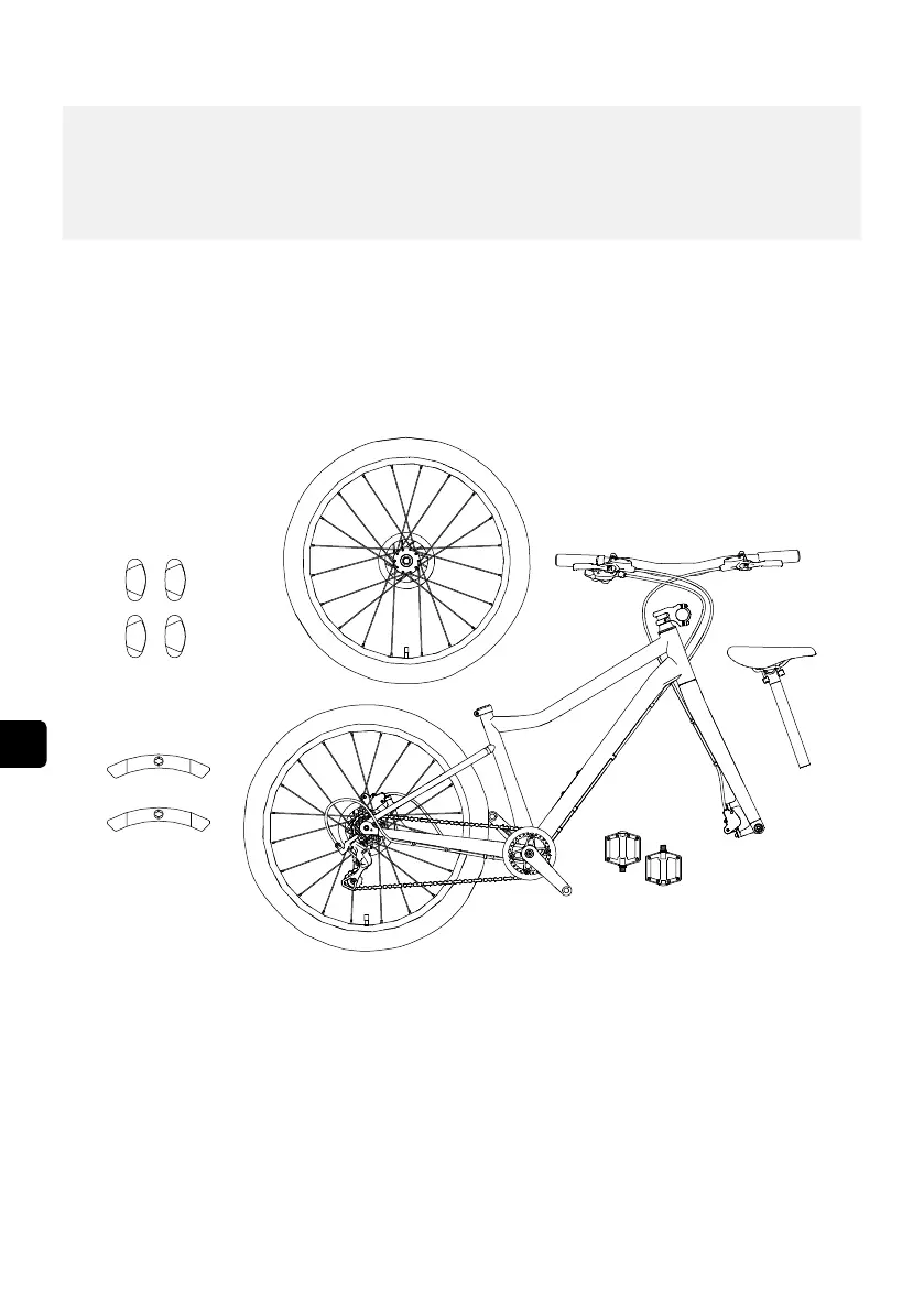 Pagal paveikslėlį patikrinkite, ar yra visos „woom“ dviračio dalys.