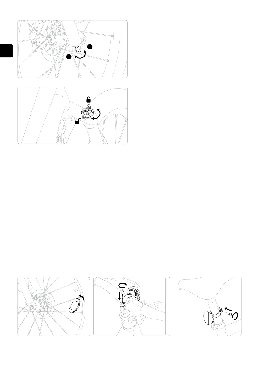 Fixez les catadioptres clipsables aux rayons. Montez le catadioptre blanc sur le guidon et le catadioptre rouge sur la tige de selle.
