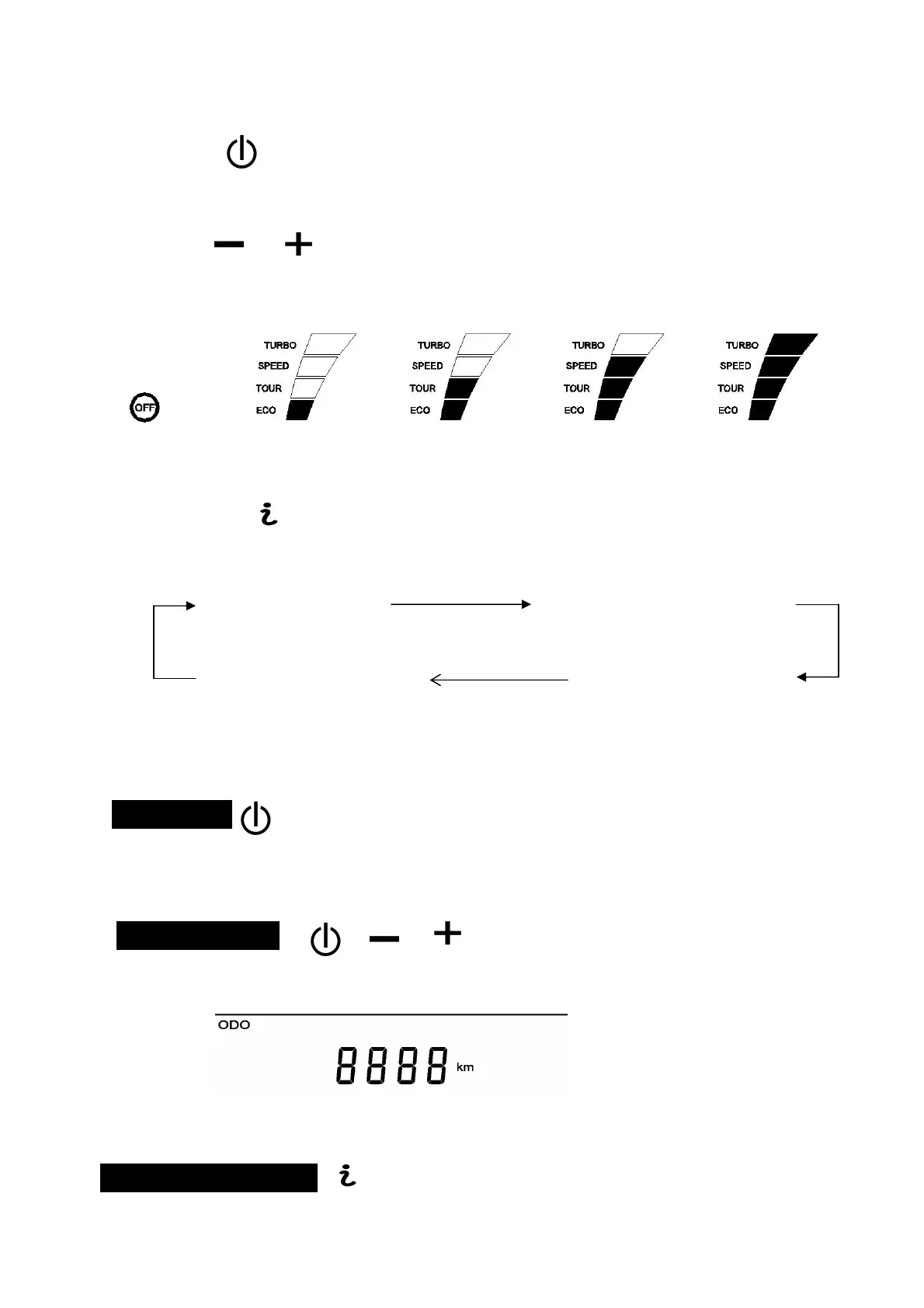 There are 4 levels of assistance. Press the +/- buttons to adjust the power assist level. The default is ECO