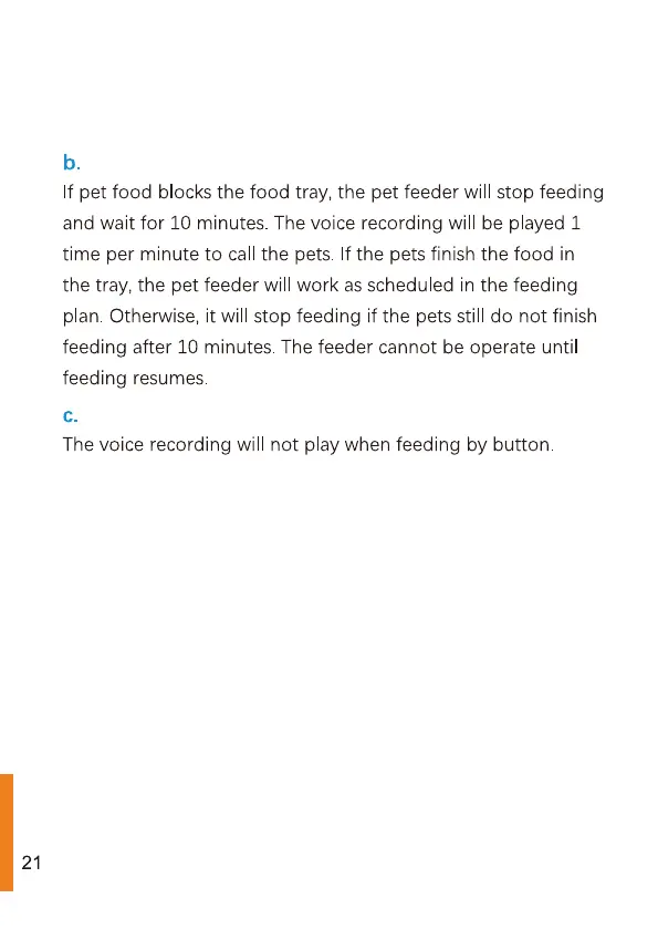 If pet food blocks the food tray, the pet feeder will stop feeding
