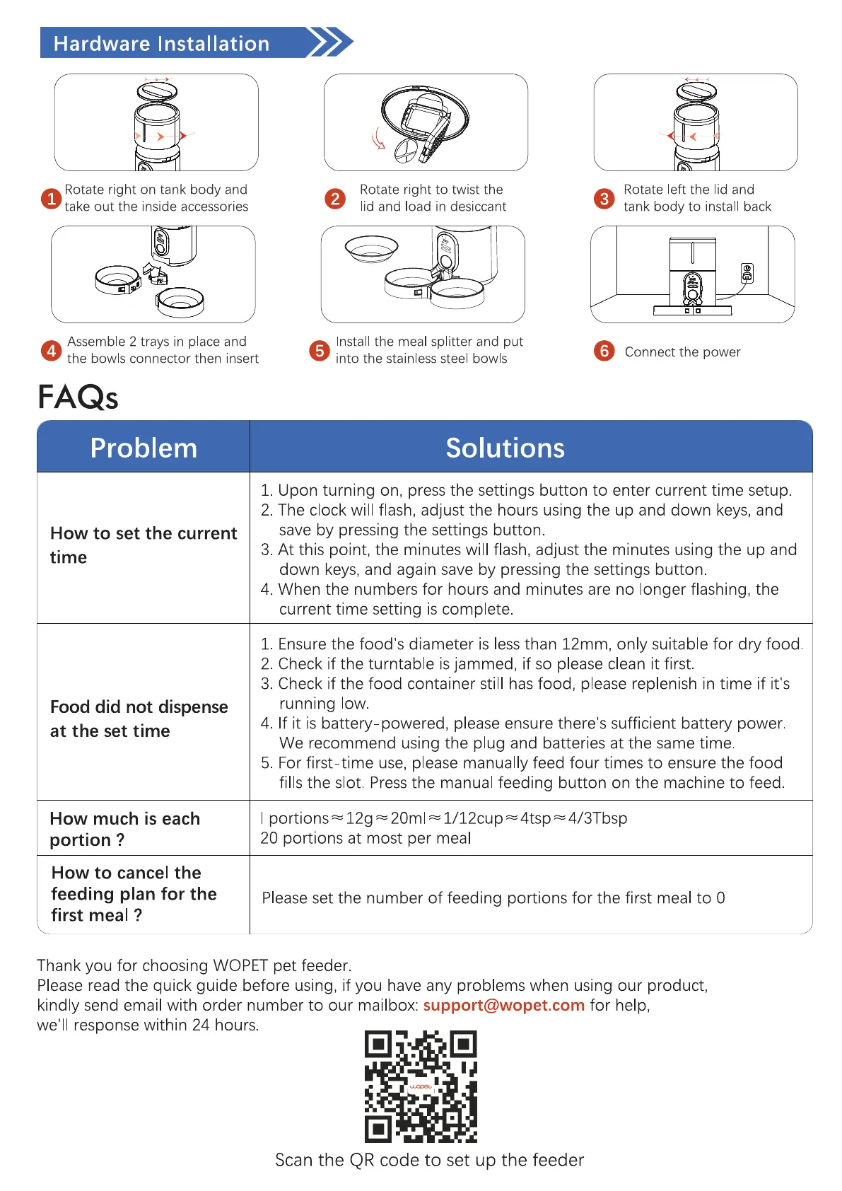 WOPET FT50D - Hardware Installation; FAQs; How to Set Current Time; Food Dispensing Issues