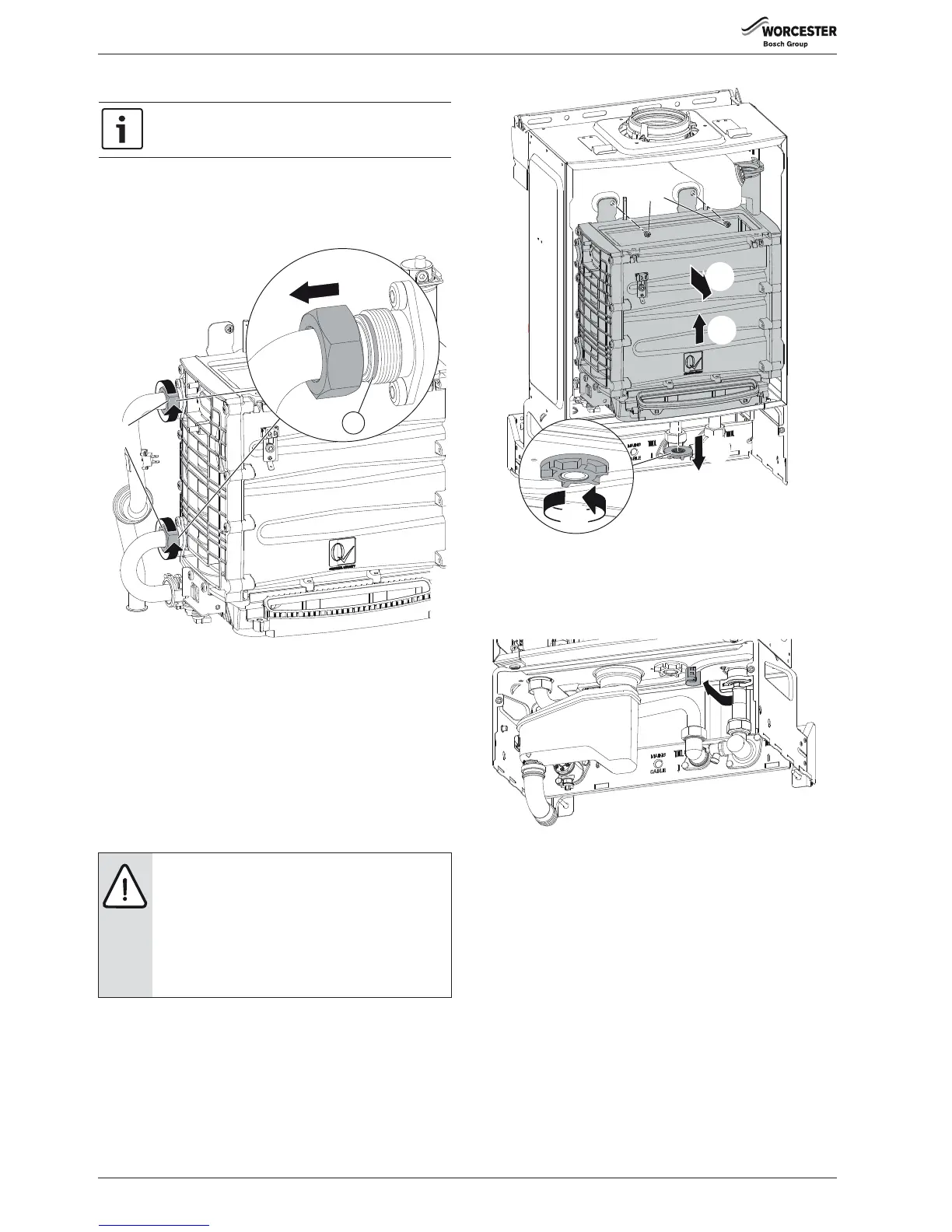 4.Lift the heat exchanger until the lower connection clears the hole in