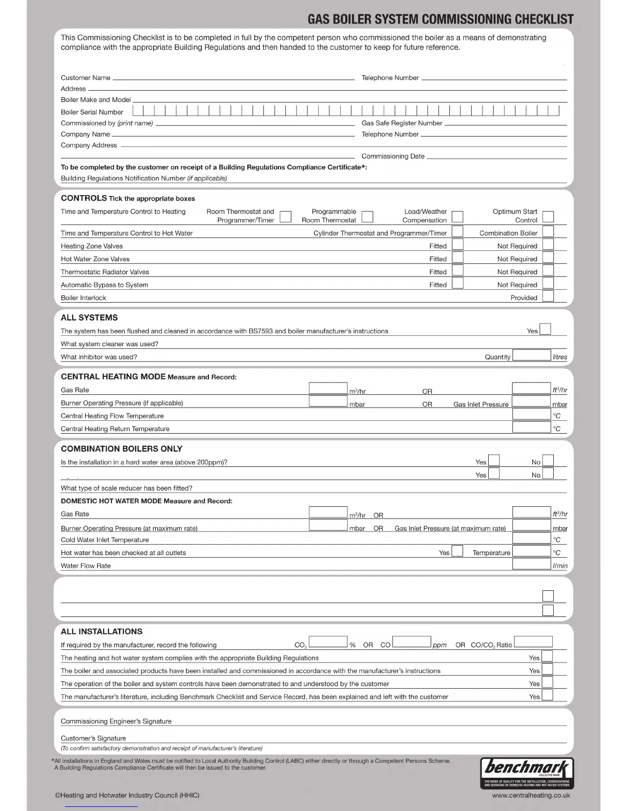 Failure to install and commission according to the manufacturer’s instructions and complete this Benchmark Commissioning Checklist will invalidate the warranty. This