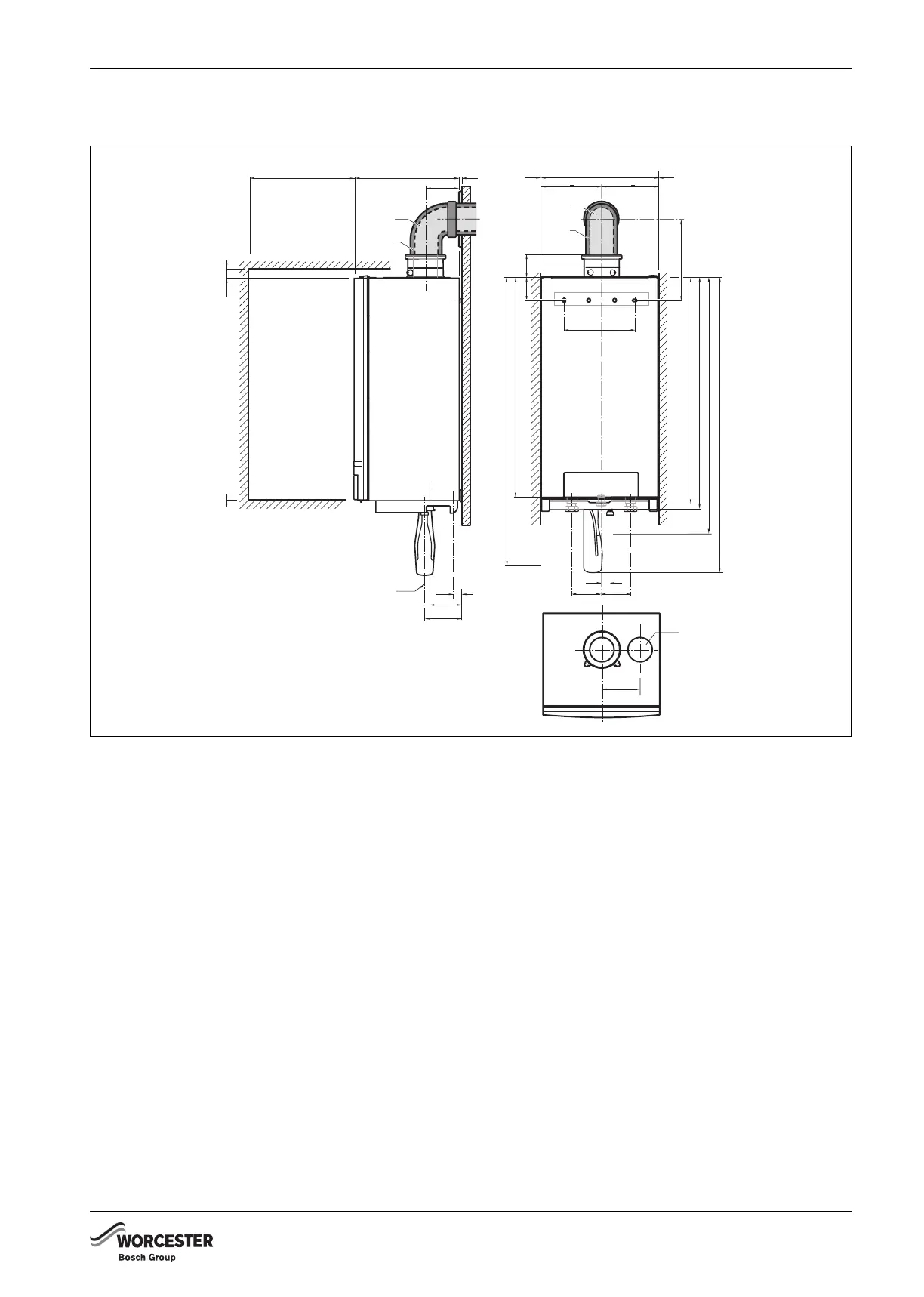 CFO Distance from wall bracket to center of horizontal flue elbow; 337.5 mm for Ø 80/125 flue and 339.5 mm for Ø 100/150 flue