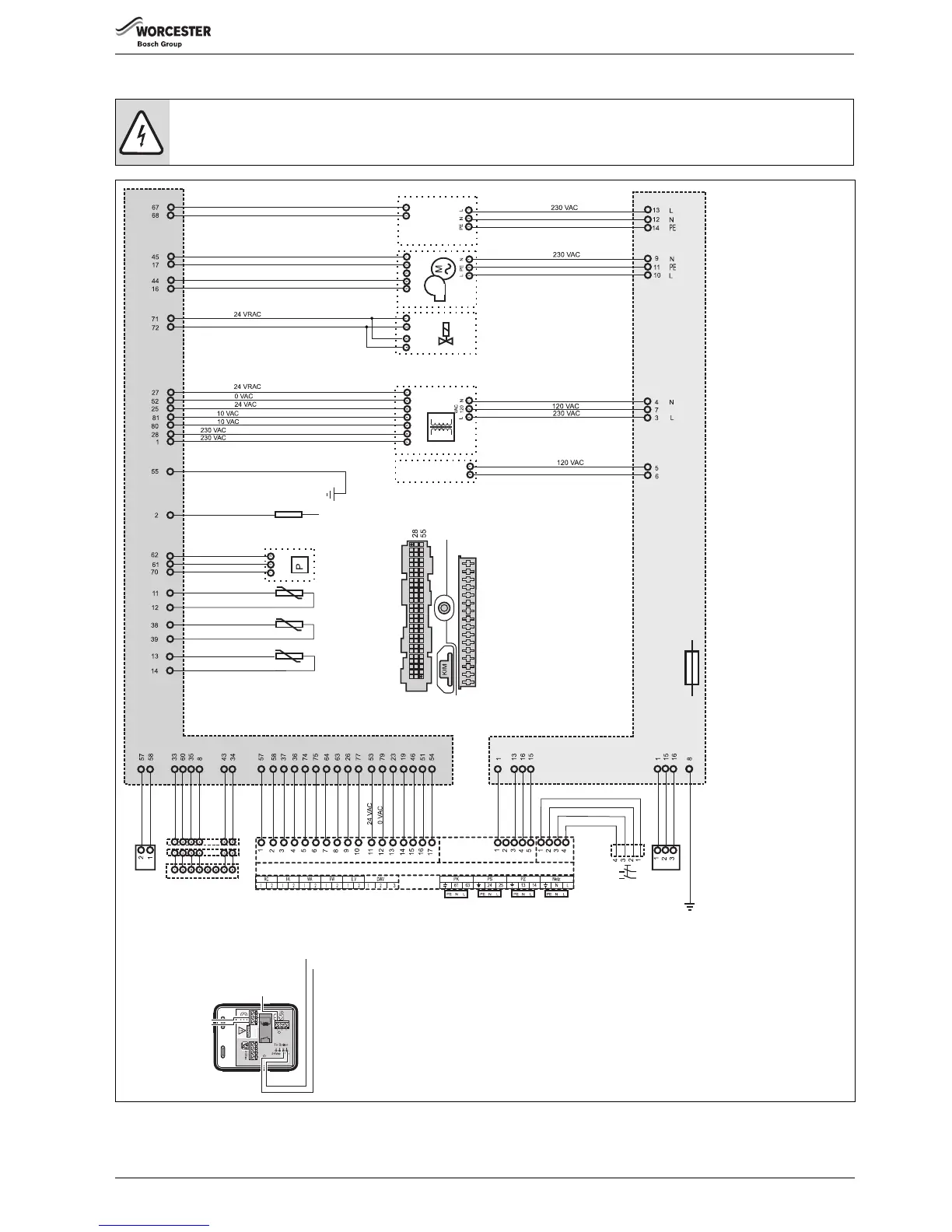 ▶Do not directly connect a 230 V thermostat to this boiler. Use the grey 230V connection box (supplied with GB162-50/65).