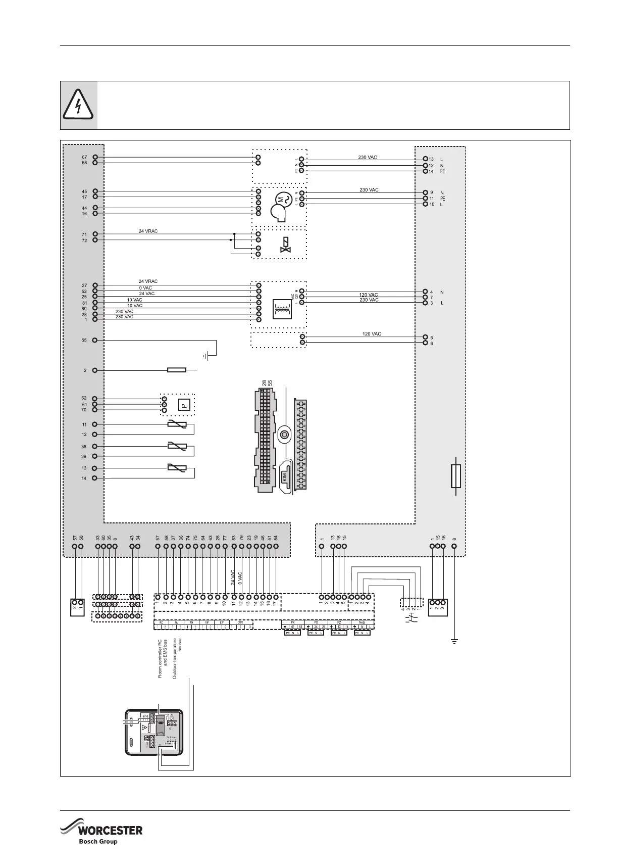 B Do NOT directly connect a 230 V thermostat to this boiler! Use the grey 230V connection box (supplied