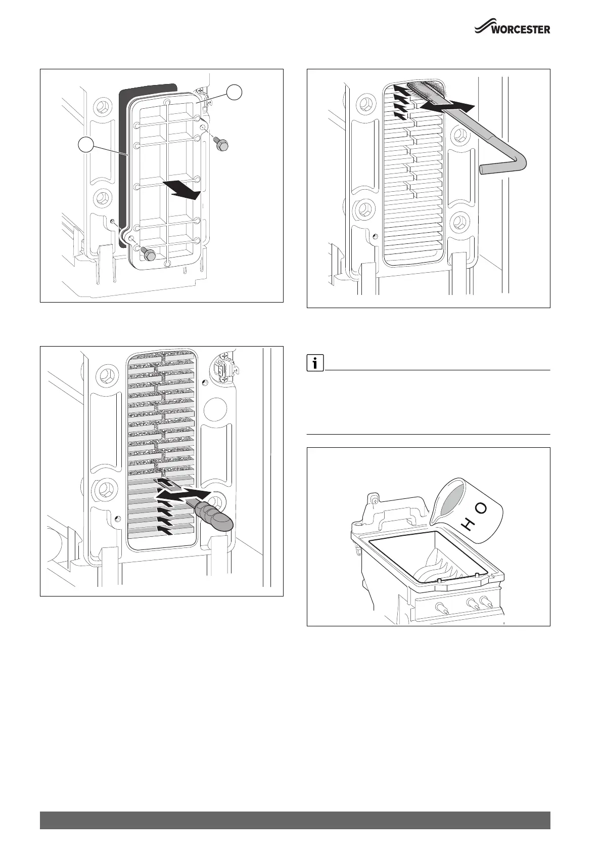 ▶ Pour water into the heat exchanger to rinse the debris through to the