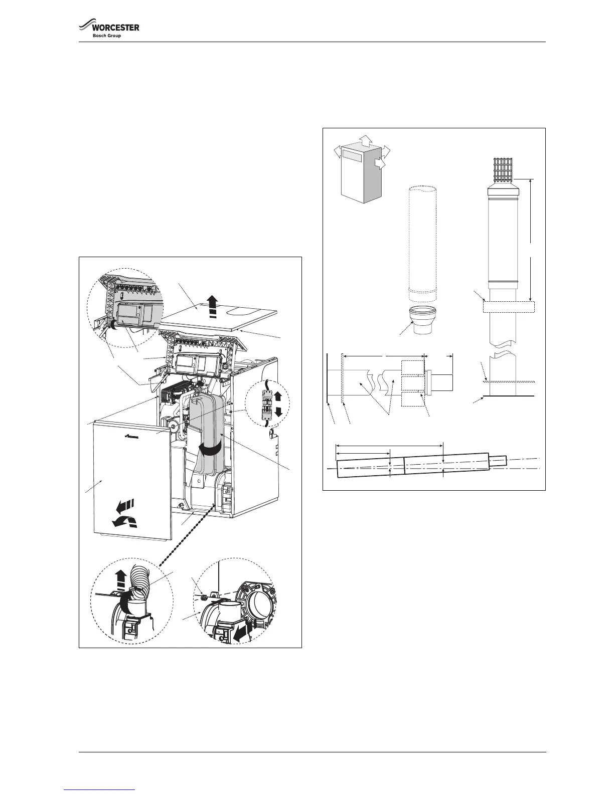 The flue can exit the boiler from outlets A, B, C or D allowing vertical (RS)