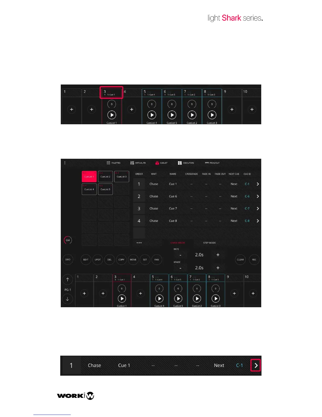 LightShark has a Cue and Cuelist storage where the user may navigate through all the