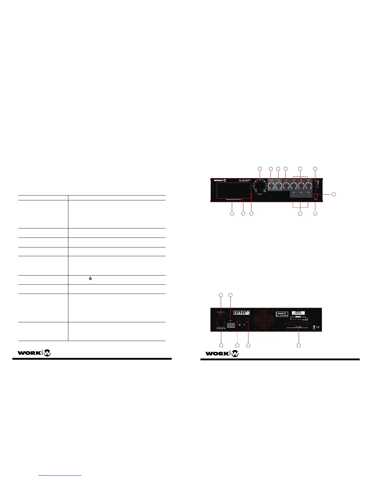 - Salidas de transformador aisladas : 4, 8, 16 ohm, 25, 70, 100 V