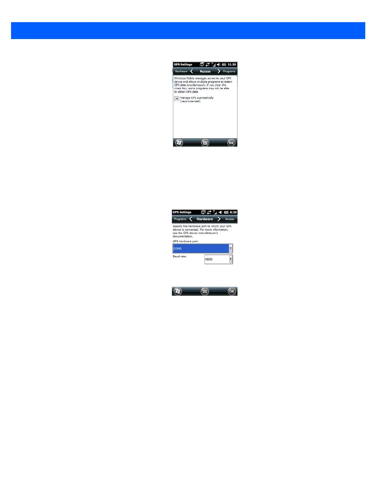 • Tap on the Hardware tab, and set the GPS hardware port to COM2. Set the Baud rate to 4800.