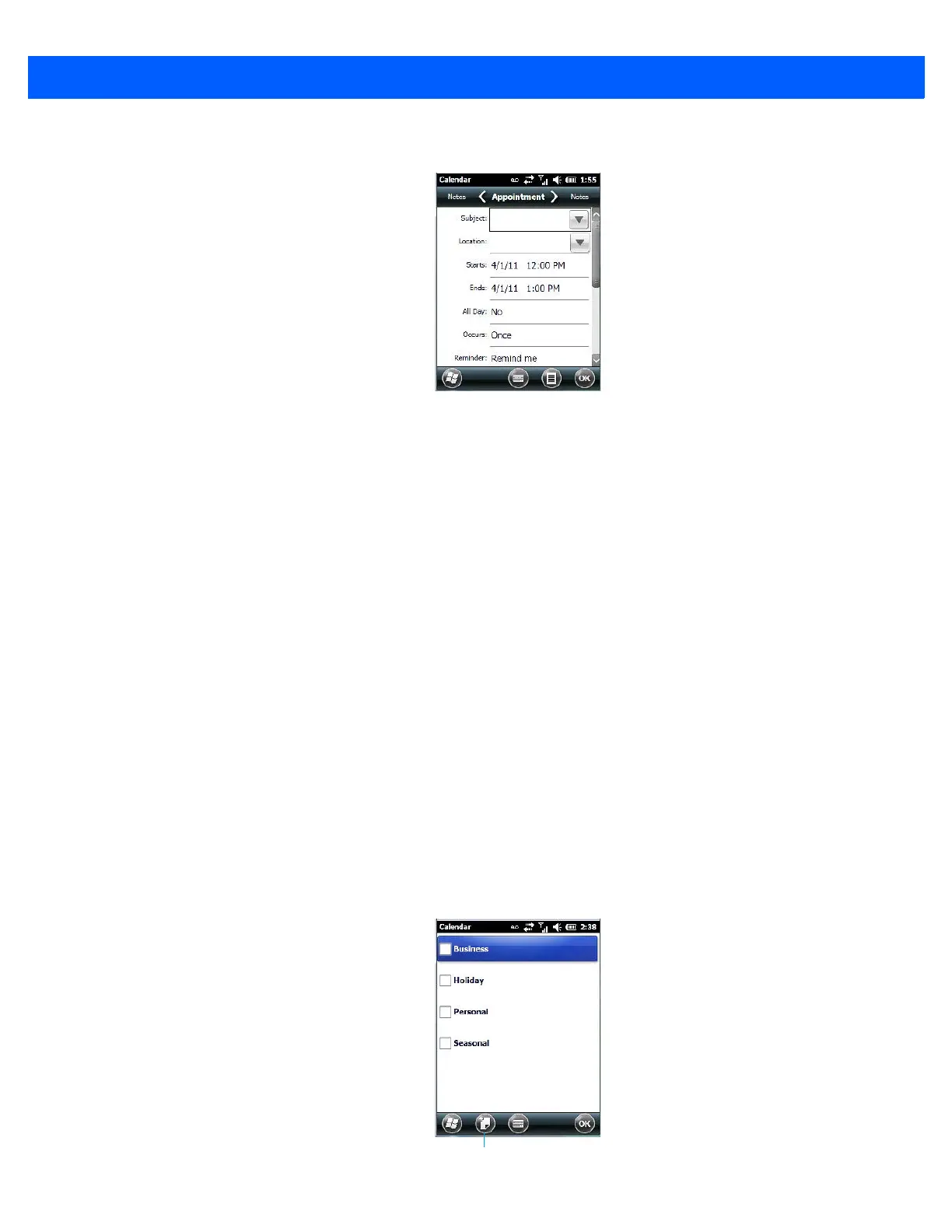 • Tap the appointment in the Calendar screen to display it in a summary screen. The reminder is indicated
