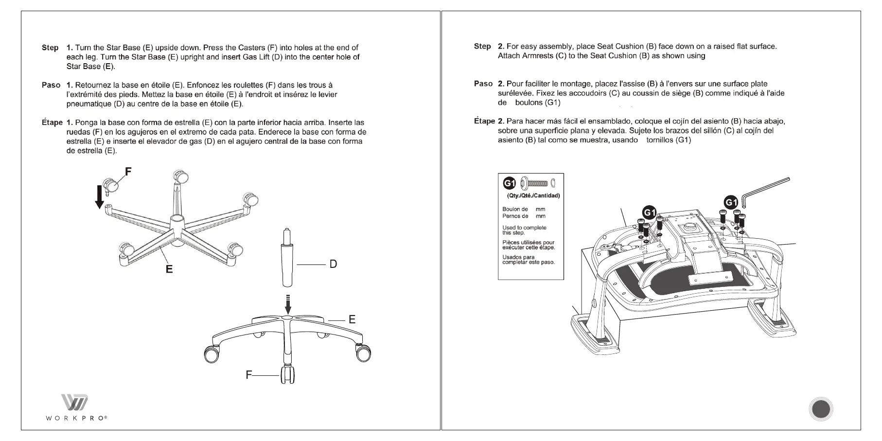 WorkPro 12000 Series - Step-by-Step Assembly Guide; Base Assembly and Gas Lift Installation; Seat Cushion and Armrest Attachment