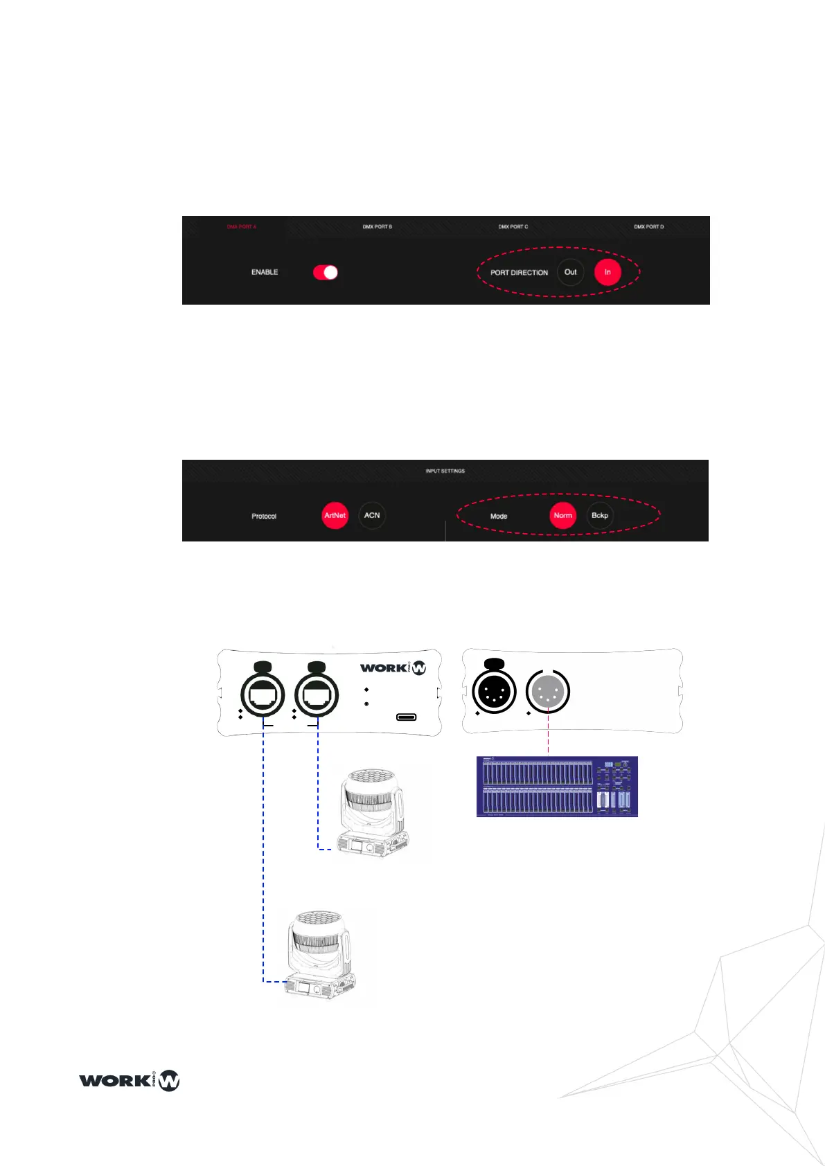 XLR-5 input ports to Art-Net or ACN via Ethernet ports. It is possible to congure the