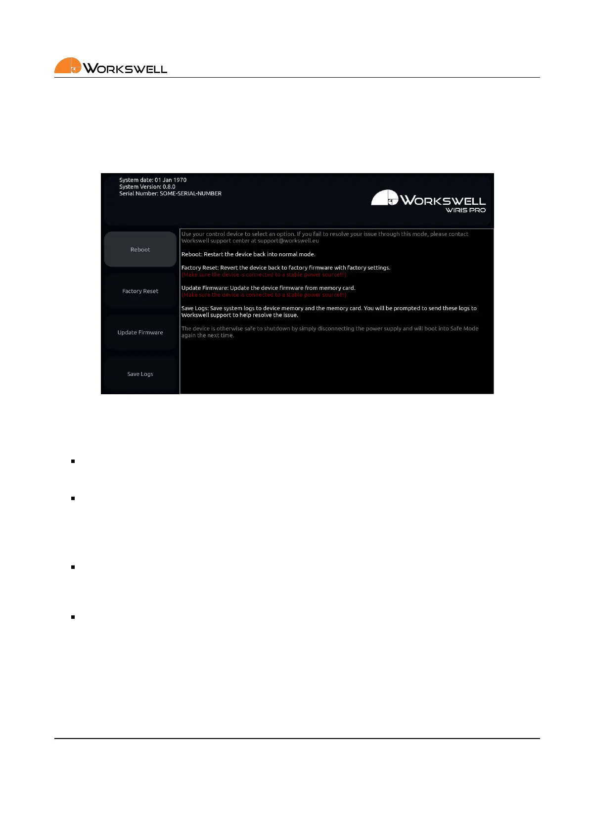 support.workswell.eu and report the problem, supplying the system logs saved through the fourth opon.