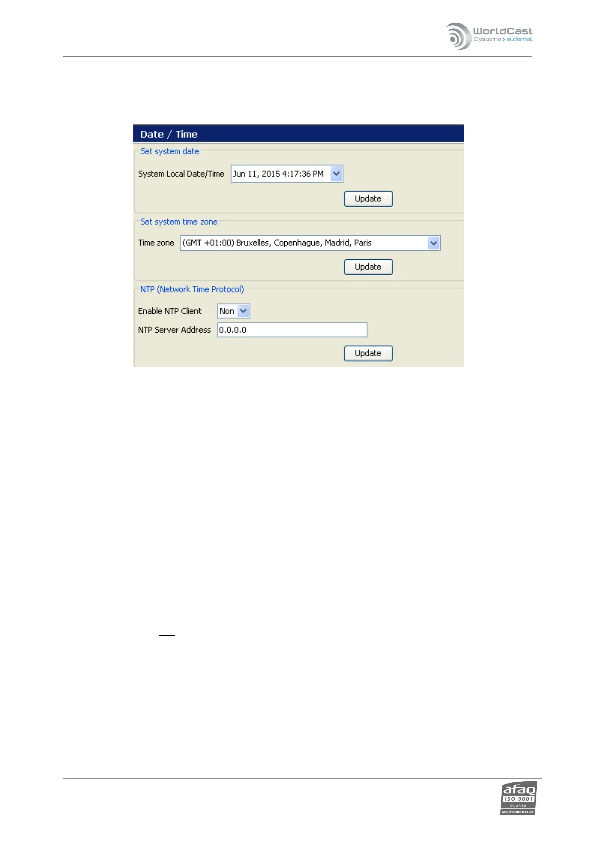 The user can enter a time server address to update the equipment’s internal clock automatically.