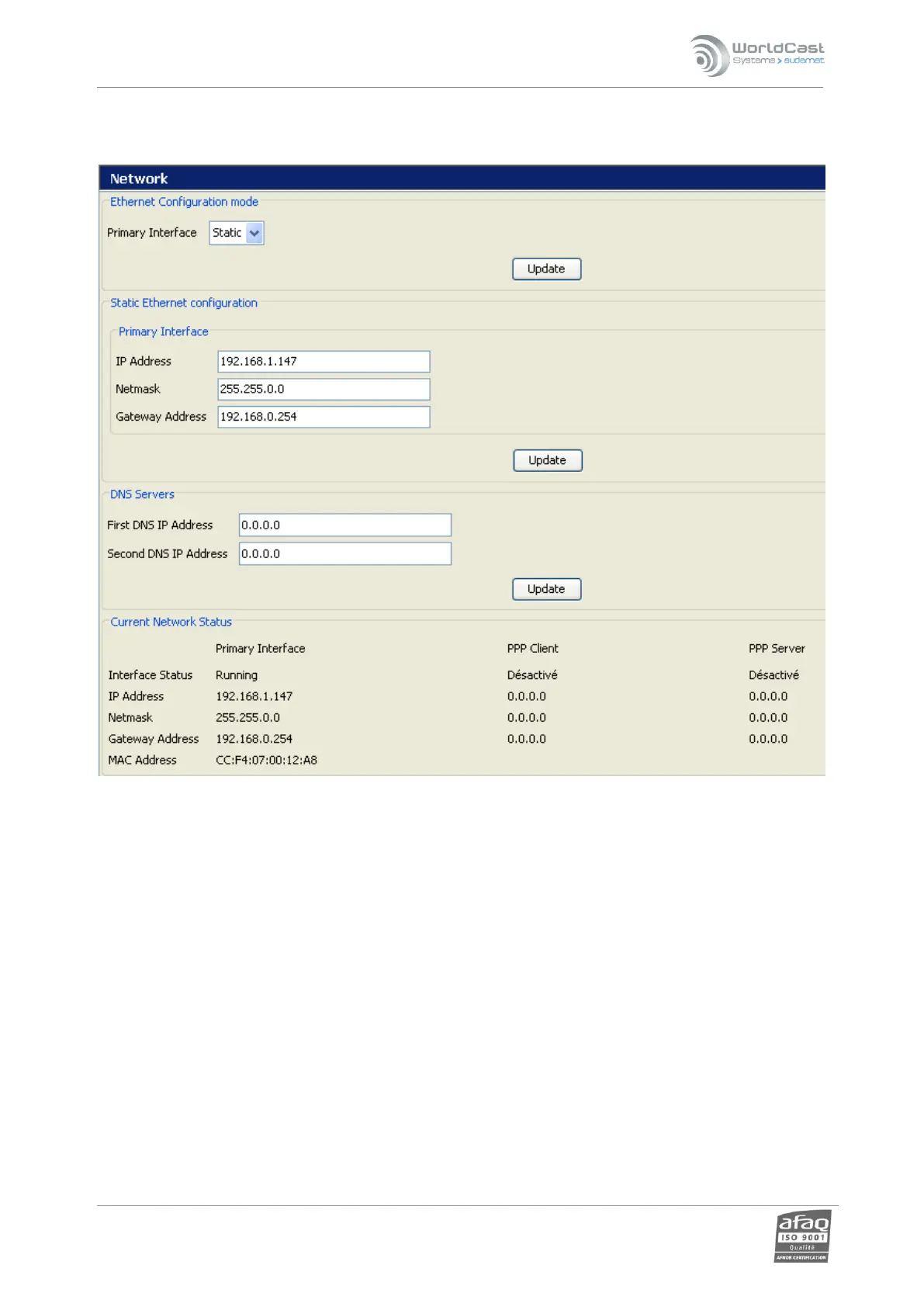 DNS Servers: DNS configuration. Mandatory if before using DNS addresses on other configuration pages.