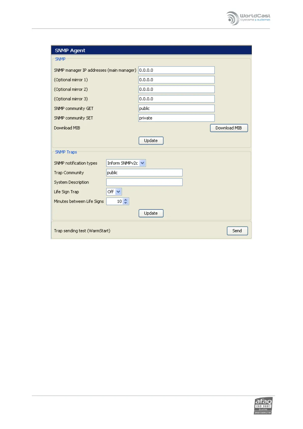 Trap sending test: enables the user to carry out a test according to the trap settings.