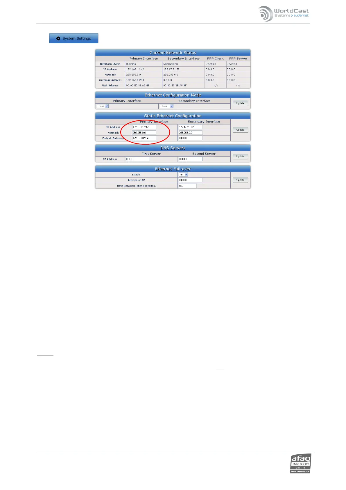Now, go to the System Settings page to set the primary IP address. Do not modify the secondary IP address.