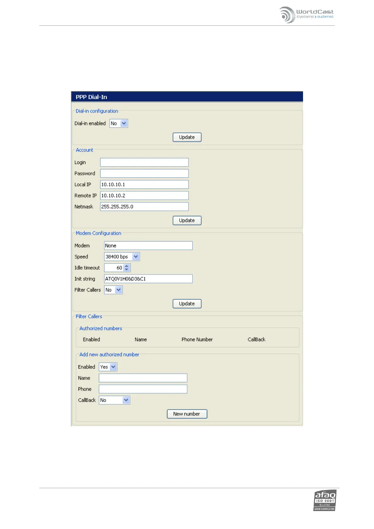 o Dialin configuration: controls the “incoming calls” function. NOTE: This parameter also